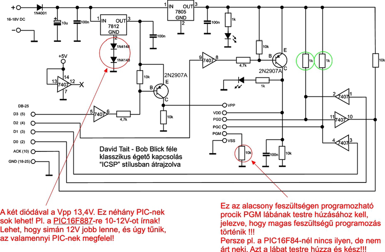 Tartaléknak újjáépítettem a David Tait - Bob Blick féle klasszikus égetőmet. Mellékelem a rajzát. Sokat vacakoltam vele, mert "mindent" égetett, legalábbis PIC16F628A-t, PIC16F887-et, PIC18F2550-et, de PIC16F877A-t NEM! Végül a megoldás az lett, hogy a PGD és PGC lábakra menő kimenetek 10k-s felhúzó ellenállásait 1k-ra cseréltem. A rajzon zölddel bekarikáztam. Itt a fórumon már javasolta valaki. Jelentem: ezzel a cserével megoldódott a 877A programozása is. Még egy dolog: ha valaki a Watt féle programot (WPB_F18_F16_F12_v1.32b.exe) használja, az nem ismeri fel a 877A-t, de kézzel beállítható és utána rendben beégeti. A hozzászólás módosítva: Márc 24, 2016