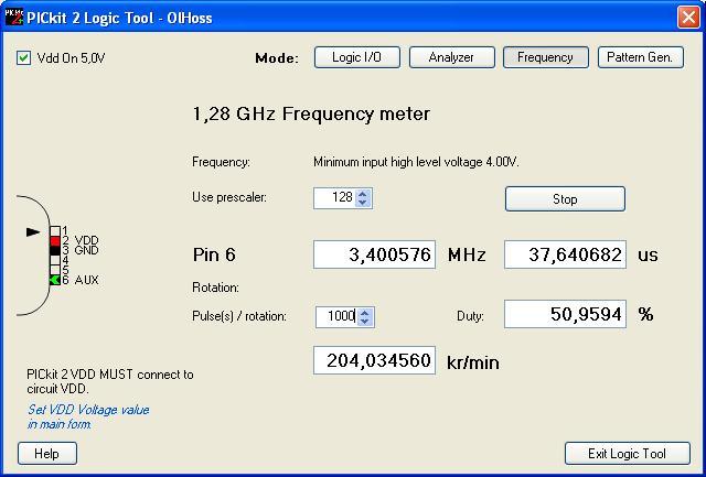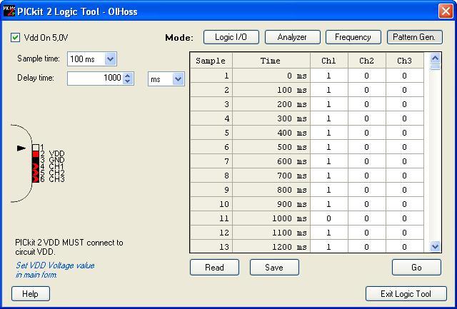 Meglepően jól vizsgázott a PICKit2 az analóg mérések tekintetében. A PC sok mindent ki tud számolni: A feszültségosztó felső tagját, egy diódán eső feszültséget... A számított ellenállás hibája 5 - 10% is lehet, a képen egy névelegesen 10k (multiméterrel mérve 9.9k) és egy 100k (99.7k) a Vdd és a PGC ill PGD vonalak közé iktatva. Persze a lehúzó 4k7 ellenállásokat nem épen a mérés igényeinek megfelelően választottam... A dióda nyitófeszültsége is elfogadható egy jó / rossz vagy a felépítés (szilícium / germánium / Schottky) eldöntéséhez.
