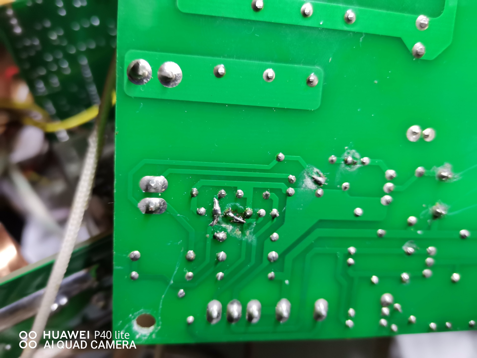 Pontosan ilyen az én AWI inverterem alsó panelja is. A tiéd felső részében van eltérés. Javítottam már én is ezt a részt. A kék kondik között a sok fekete diódából lehet valamelyik zárlatos. Ha ott nincs zárlat, akkor a munkakábeledben is lehet hiba. Nálam az a szép piros ellenállás elégett, nem is tudtam az értékét, csak tippeltem, de jó lett.
