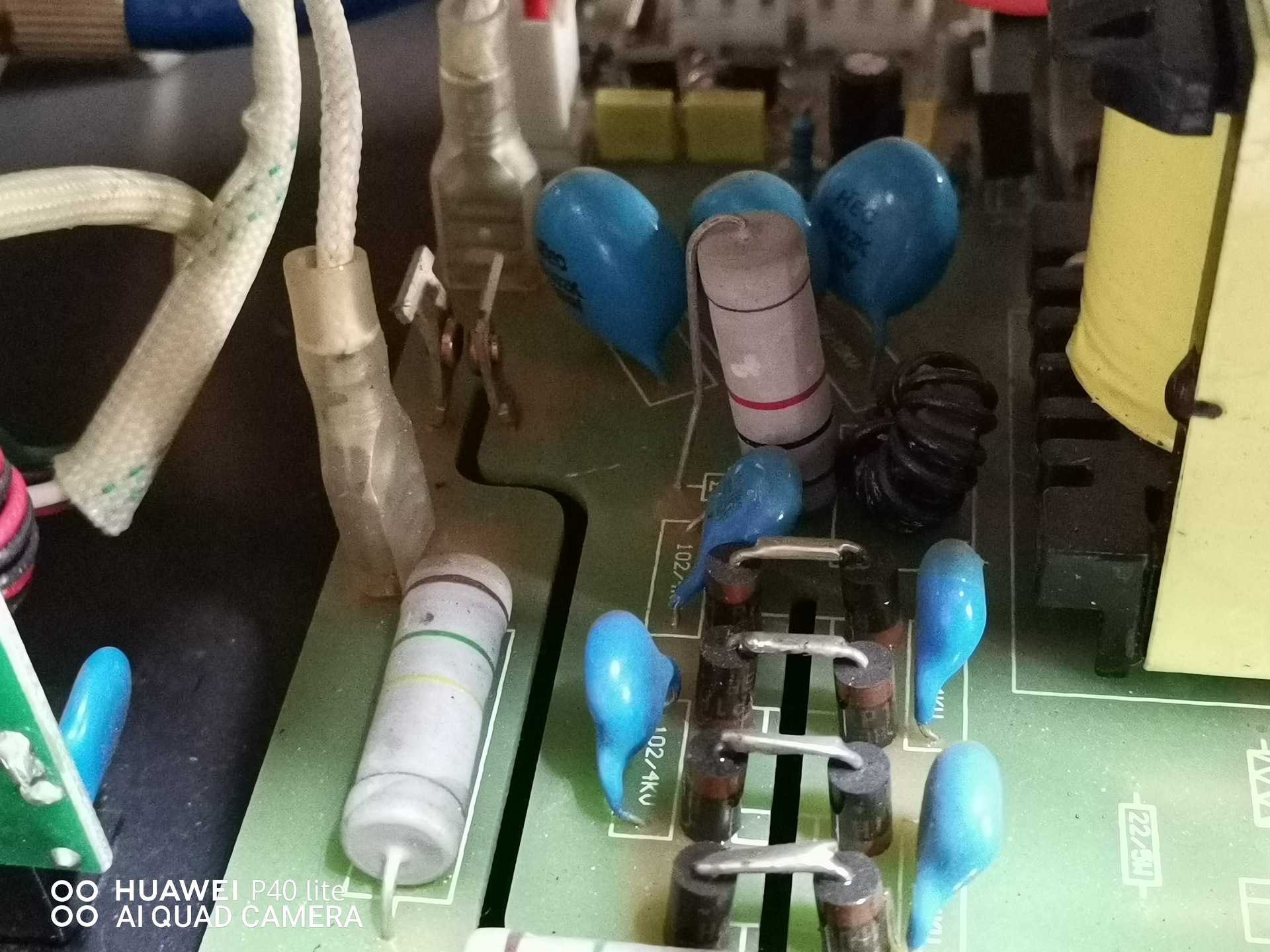 Ott a két kis érintkező vagy mi ami közt szikrázik. És mellette a két égett alkatrész. A szürke henger is elégett.