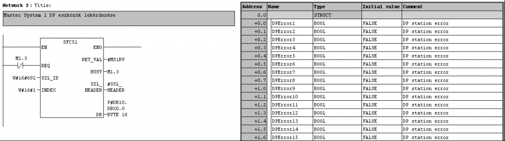 Idézet: „De volna 1 olyan kérdésem hogy amit a weboldaladon irtál az ob86 ba irt programot.. azt ha megcsinálom, mind a 17 dp-re az ominozus hálozatvesztös gépen, az lehet nekem segitség?” Csak remélni tudom hogy igen. ![]() De így nem tudom melyikre gondolsz hivatkozás nélkül. Az OB86-ban kiszűrni nem olyan egyszerű dolog. Talán megfelel az SFC51 is, ami lekérdezi az összes DP eszközt és mindegyikhez rendel egy bitet, hogy jelen van-e (melléklet). Idézet: „azt meg tudnád mondani, hogy az ob86_z23 az mit takar?” Jelentése a hibakódtól függ. "Expansion rack failure" esetén pl. megmondja hanyadik rack. de pl. "Distributed I/O devices: failure of a DP master system" hiba esetén már a DP master ID van benne. "Failure of a DP station" hibánál, meg a DP slave címe.