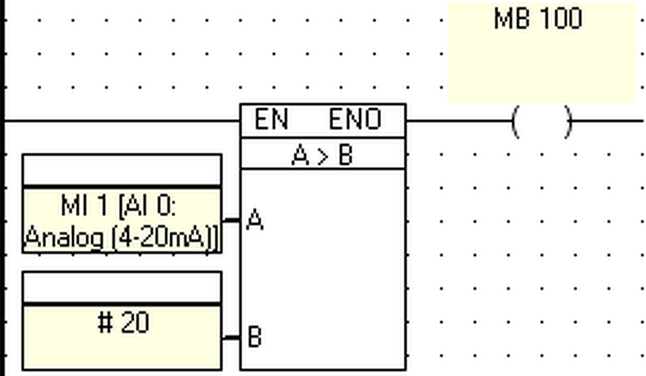 Üdv. Ismét Unitronics JZ20 R31 PLC programozásban kénék segítséget. Most analog bemenetet kellene használnom. Hogy tudok mondjuk egy küszöbérték kapcsolót megvalósítani a létrába? Amikor kiválasztom az analog input-ot, megadom mondjuk az A0 bementet. Megadom, hogy 4-20mA -es áramjelet akarok figyelni. Amikor ez megvan kéri, hogy rendeljem ezt egy MI-hez. Eddig ok. De hogyan tudok ezzel az MI-vel bármit is kezdeni? Mondjuk egy nyomás távadó esetén?Mondjuk 12,5mA átfolyó áramnál hogyan tudom bekapcsolni a O0 kimentet (amivel mondjuk egy szivattyút kapcsolok)? Kár, hogy semmi magyar nyelvű leírás nincs ehhez a PLC-hez (vagy csak Én nem tudok róla?)...