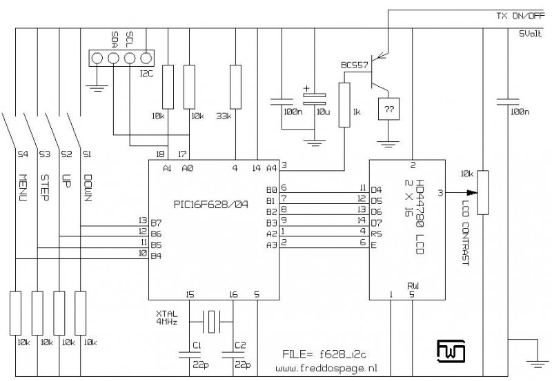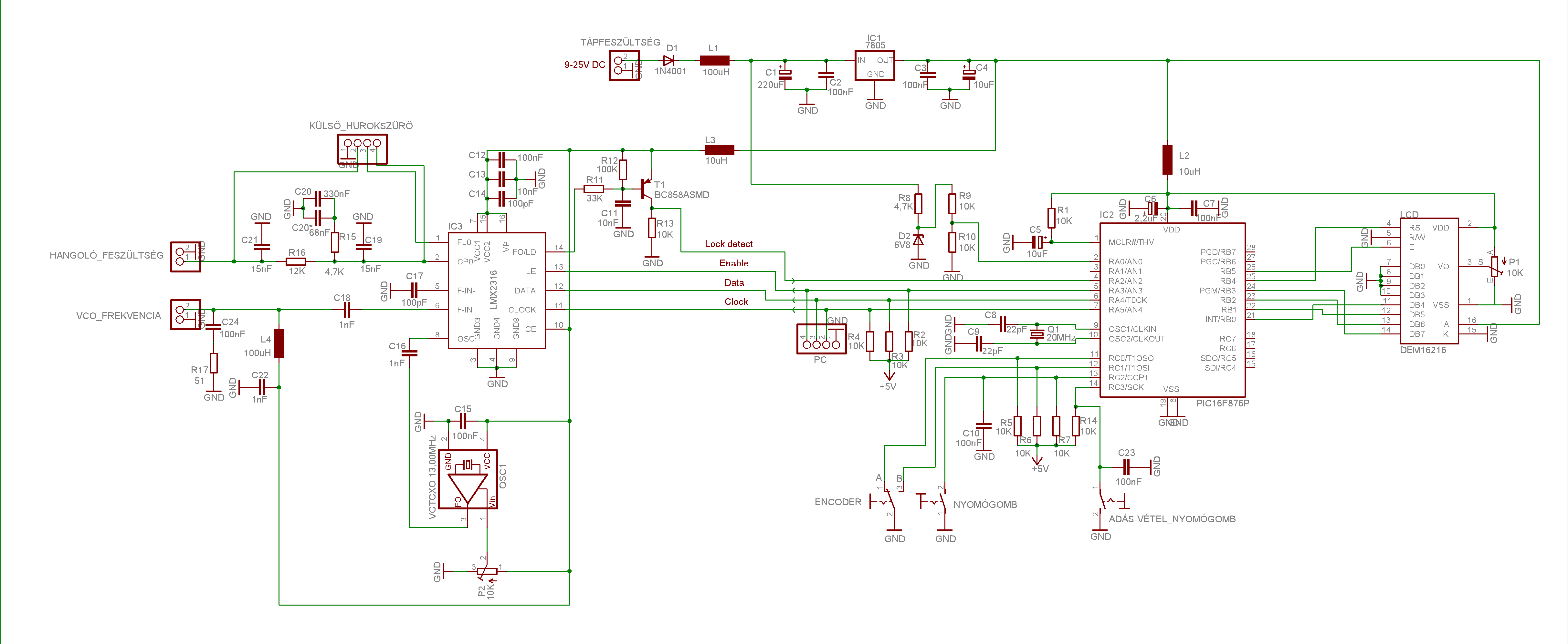 Egyik fórumtársunk kérésére kicsit továbbfejlesztettem a cikkben közölt PLL vezérlő programját. A változtatás lehetővé teszi, hogy komplett adó-vevőben is alkalmazhassuk az áramkört. Eddig egy féle frekvenciát volt képes előállítani és kiírni, ráadásul a kiírt vételi frekvencia szuperheterodin vevők esetében a KF frekvenciával növelt vagy csökkentett érték. Adásnál viszont a VCO-t át kell állítani az adás frekvenciájára, ami lehet a vételi frekvencia, vagy annak egy bizonyos frekvenciával eltolt értéke (shift). Hogy ennek eleget tudjon tenni, a programot plusz két menüponttal kiegészítettem. Az egyik menüpontban a shift értékét tudjuk megadni 0-100MHz-ig 50kHz-es lépésekben. A másik menüpontban pedig, hogy ezt a frekvenciaeltolást a vételi frekvenciához képest + illetve - irányban tegye. A megfelelő működéshez egy kis hardveres kiegészítésre is szükség van, hogy a mikrovezérlő tudtára adjuk adás van. Ezt a PIC 14. lábának földre húzásával érhetjük el (melyet előtte egy ellenállással a +5V-ra kötöttünk). Ha adásra váltunk, a kijelzőn az "Adas frekvencia" jelenik meg és a kiírt érték a VCO valós frekvenciáját mutatja. A módosított programok (külön az LMX2306-hoz és külön az LMX2316/26-hoz) valamint a hardveres kiegészítés a fájlmellékletekben találhatók. Időközben a használat során, egyes esetekben felmerült hogy a VCO frekvenciáját az áramkörbe juttató hosszabb 50OHM-os koax kábel PLL felöli végét le kellene zárni egy 51OHM-os ellenállással, a reflexiók elkerülése érdekében. Ha valaki úgy tapasztalja hogy nem elég érzékeny a PLL frekvencia bemenete és hosszabb koaxal vitte oda a jelet, akkor ezt egy SMD ellenállásal utólagosan kösse a GND-re a kábel végénél. Ha nincs szükségünk távtáplálásra és az L4-et nem ültetjük be, úgy a C24 is elhagyható és az ellenállás közvetlenül a bemenetre köthető. Ilyen esetben (bár máskor is célszerű) a VCO frekvenciáját galvanikusan le kell választani egy kondenzátorral a zárlat elkerülése miatt a koax VCO felöli végénél. Ez az utólagos ellenállás is szerepel a rajzon R17 néven.