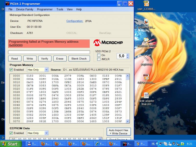 Megépitettem ennek a Pll-nek a 2800Mhz-es változatát,de sajnos a programot nem tudom betölteni a Pic-be. A programozó a csatolt képen látható hibaüzenetet irja ki. PICKIT-2 klonnal programozok és ez idáig még nem volt gond egy progrozással sem.Kérném aki tud segitsen. Joco