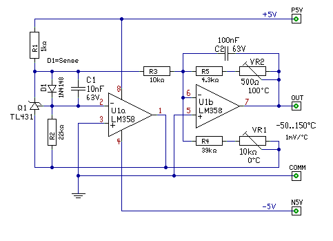Hello! Én szívesen rajzolok hozzá, egy komparátort, de azért ez az áramkör nem lesz egy csoda. Mert igaz hogy egy dióda nagyon olcsó hőérzékelő, de azért nem a legjobb. Mert a hőmérséklet változása -2mV/°C körül van, az egyszerű OPA offset feszültsége pedig 3..5mV körüli. Mivel itt a kimeneti jel a Digit-hez van igazítva, a kimeneti jel amit a 7107 mér, az 1mV/°C.
