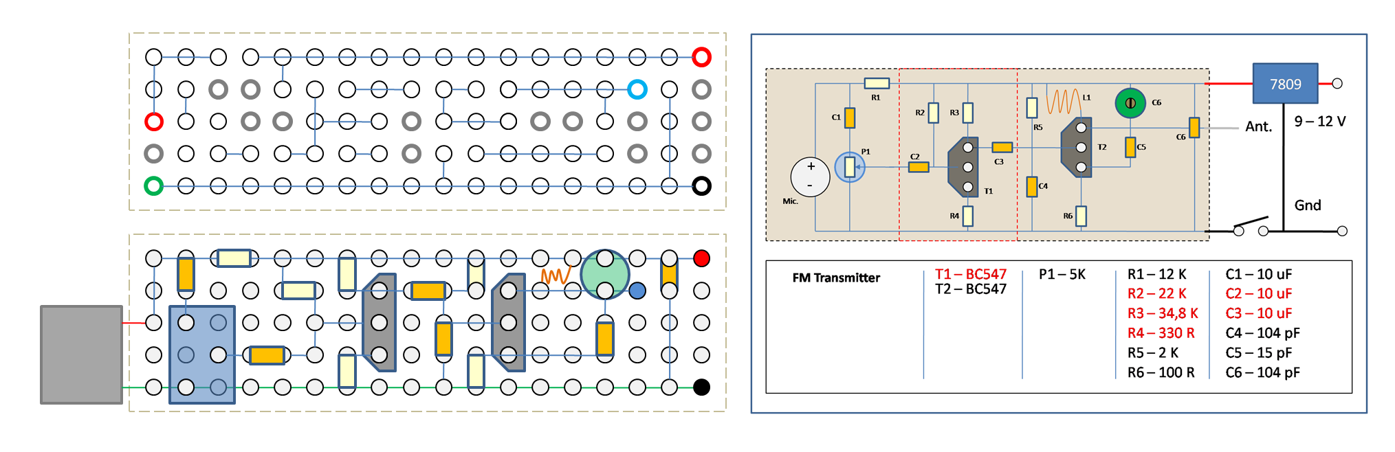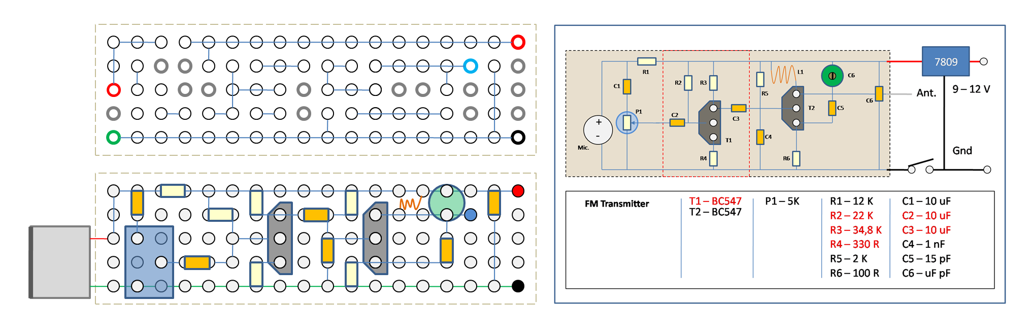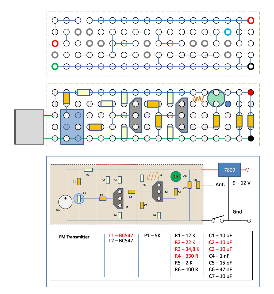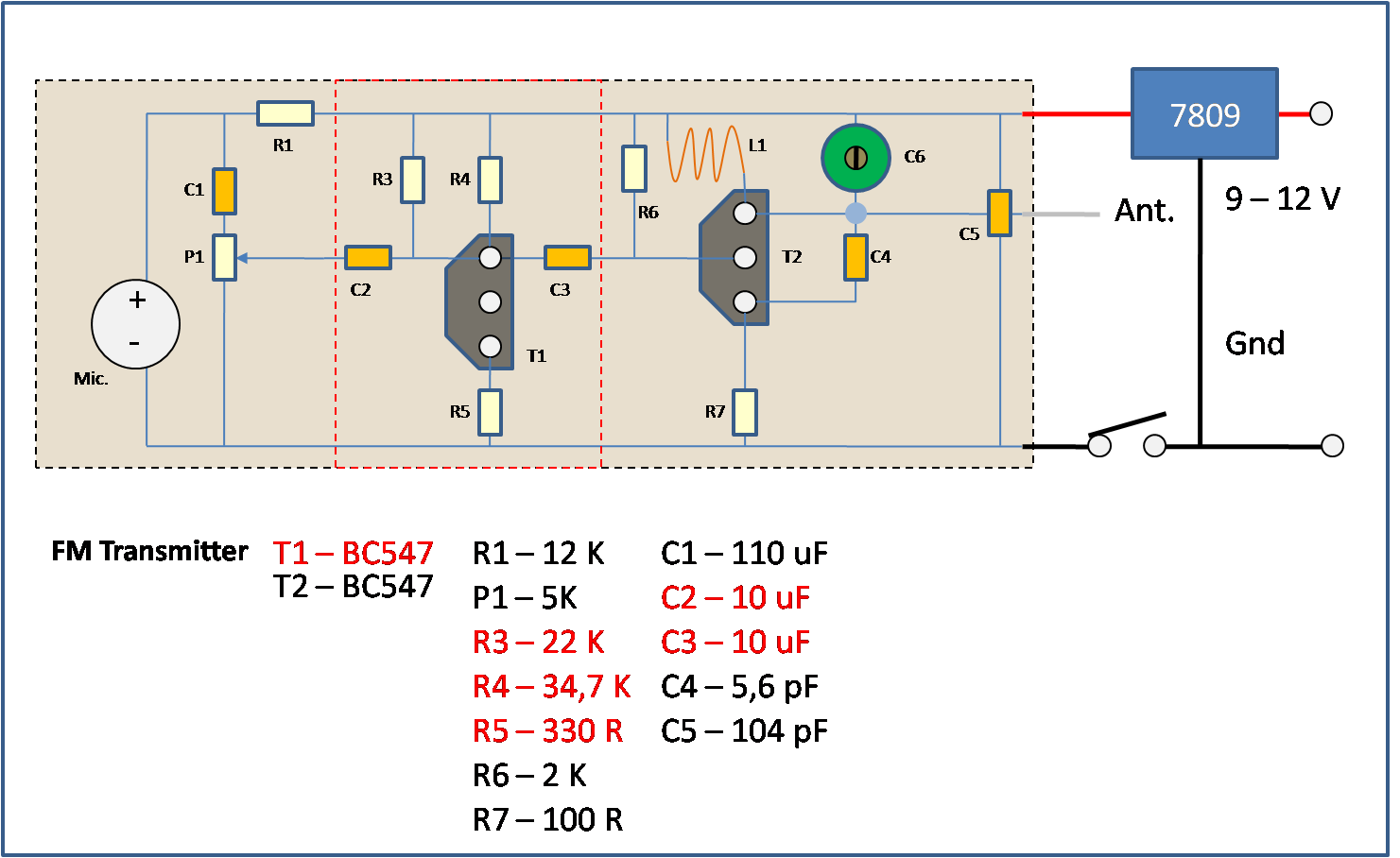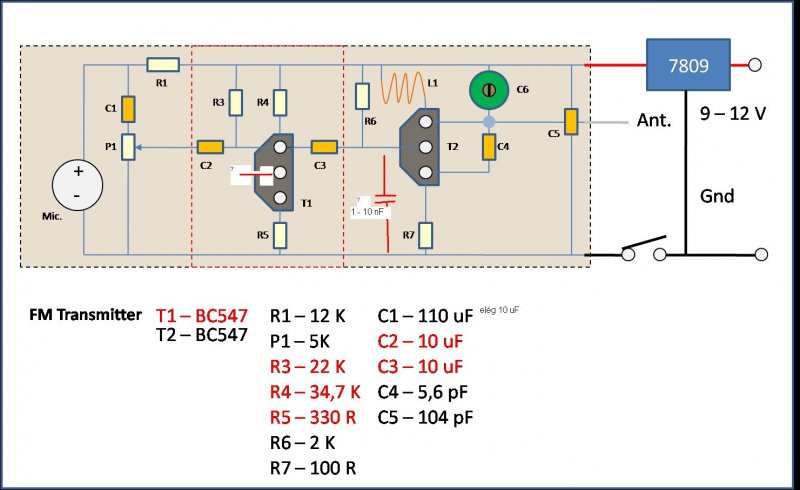 "T2 tranzisztor bázisát RF szempontból hidegíteni kell" Ez azt jelenti, hogy kondezátoron keresztül a földre kell kötni? "C1 értékének is elég 10uF" Igen, elnéztem "C1 10uF" helyett "C1 110uF"-ot írtam. Javítottam.