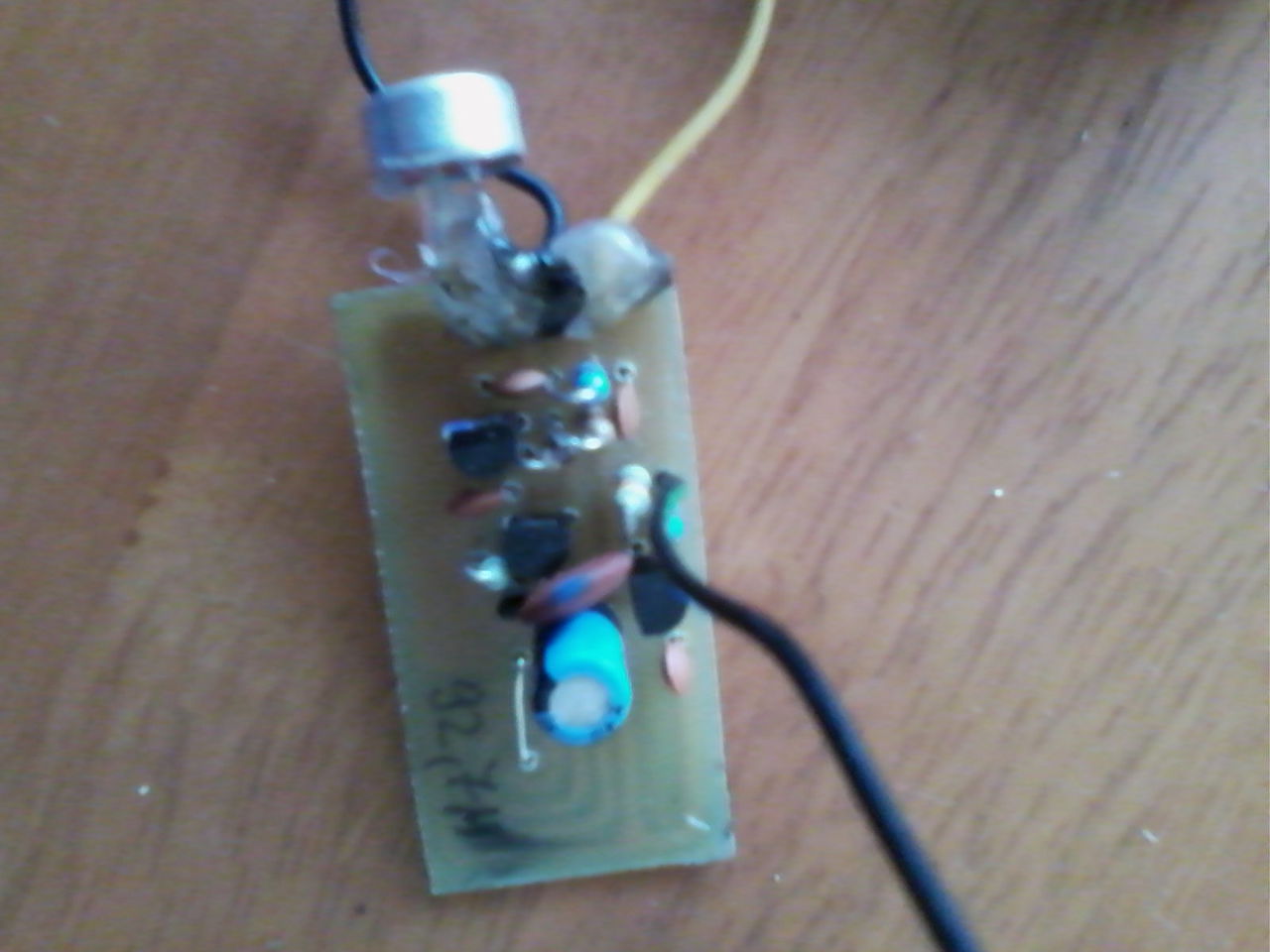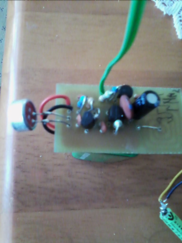 Ha erről a mikrofonról van szó .Én, megépítettem.És nagyon bevált.Az első 220 u 16 v elektrolittal ad 95.5 MHz-en.A második 220 u 10 v92,7MHz.Rajz szerint cx helyére tettem.Igaz a nyákot át kellett terveznem , h tudjam fúrni 1-es fúróval.