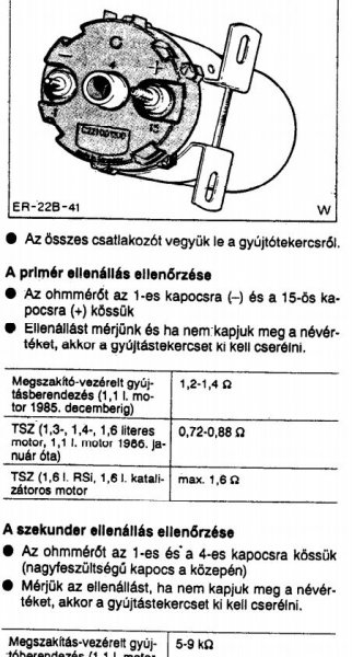 15 a gyújtás, azaz pozitív, 1 a szaggatott test, a szekundernek pedig mindkét vége ki van vezetve, azon át záródik a magasfeszültség (vagyis a két szekunder kivezetés között kapod, nem pedig a test és a szekunder között).