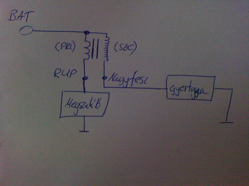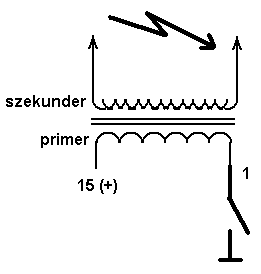 A szekunder tekercs és a "BAT"- tehát a "+" kivezetés van fizikailag összekötve az egykivezetéses gyújtótrafónál.