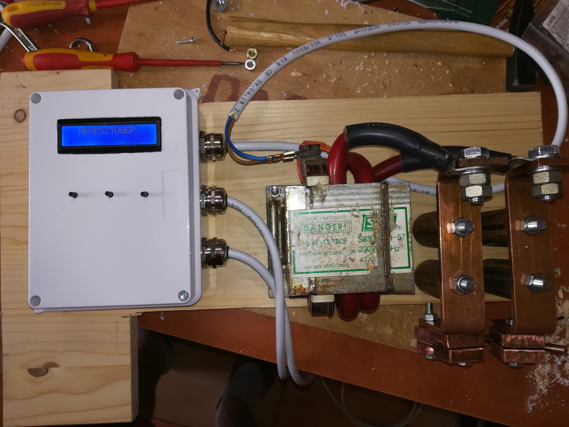 Én az átalakított mikró trafós megoldást használom egy PIC-es időzítővel egy SSR-t kapcsol. Jelenleg max 255 ms a hegesztési idő. Legutóbb 8×0,12 mm-es szalagot használtam. Nem tűnik rossznak, elég erősen tart, bár nem próbáltam letépni, de megfeszegetve elég meggyőző.