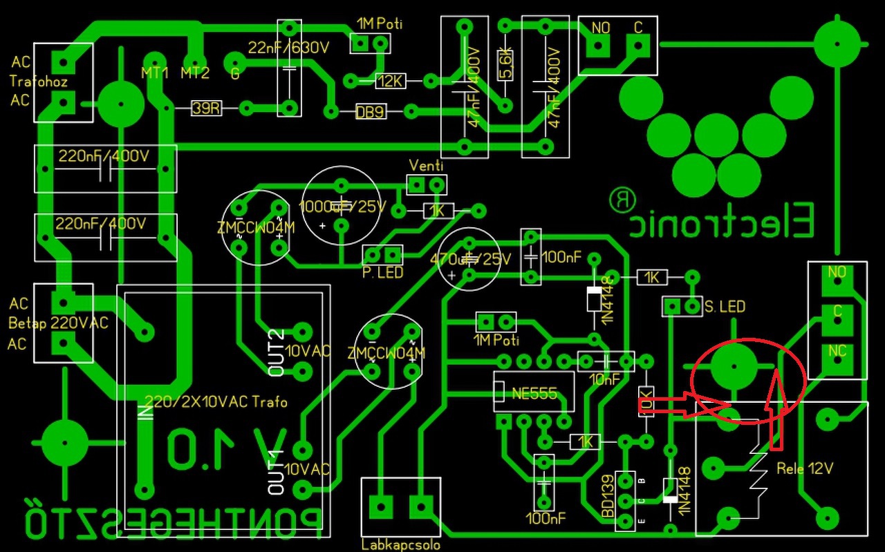 A relé kimenete ki van vezetve, amit össze kell kötni értelemszerűen a diaknál kialakított kivezetéssel. Azért van kivezetve a diaknál is a két összezárandó pont, hogy ha a "dimmer" meghibásodik, akkor a relével még lehet kapcsolgatni a trafót, hogy működjön. A potik közösítve vannak, azért van csak két pont a bekötésre. (A középkivezetés össze van kötve az egyik oldallal már a potinál) A triak típusát a trafó teljesítménye határozza meg.