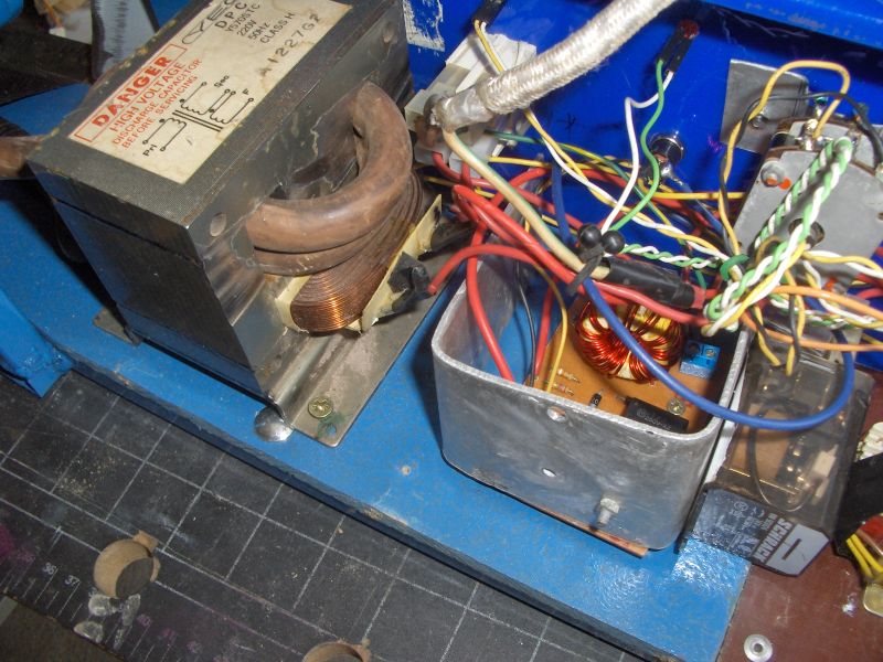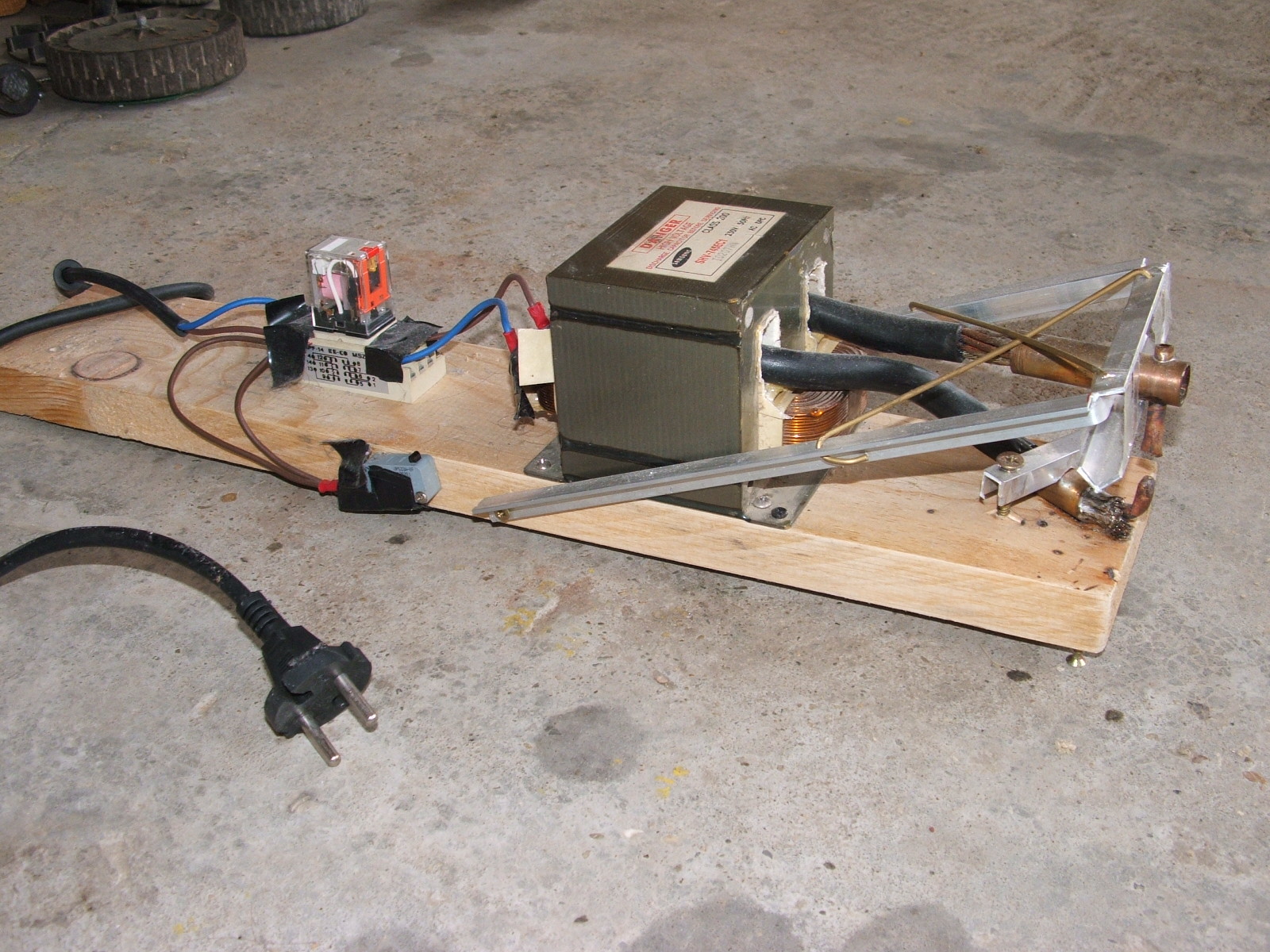 Az alapanyag: MIKROHULLÁMŰ SÜTŐ Onnan jött az ötlet, hogy volt egy mikrosütőm, aminek a trafója szekunderzárlatos volt (2000V körüli fesz. könnyen átüthet...), így hát lefűzészeltem a szekunder tekercset, majd kifúrtam (mivel be volt ragasztva), majd tekertem a helyére 1 menetet 20mm2-es sodrott rézkábelből, majd a végére forrasztottam két vörösréz fűtéscsövet . A trafó primeroldalát egy relével kapcsolom, amit egy nyomógomb működtet.A hegesztő csúcsoknak még csinálok egy erősebb felfogatást és kész is a remekmű Remélem más is kedvet kap a hulladékká vált mikrosütők újrahasznosítására