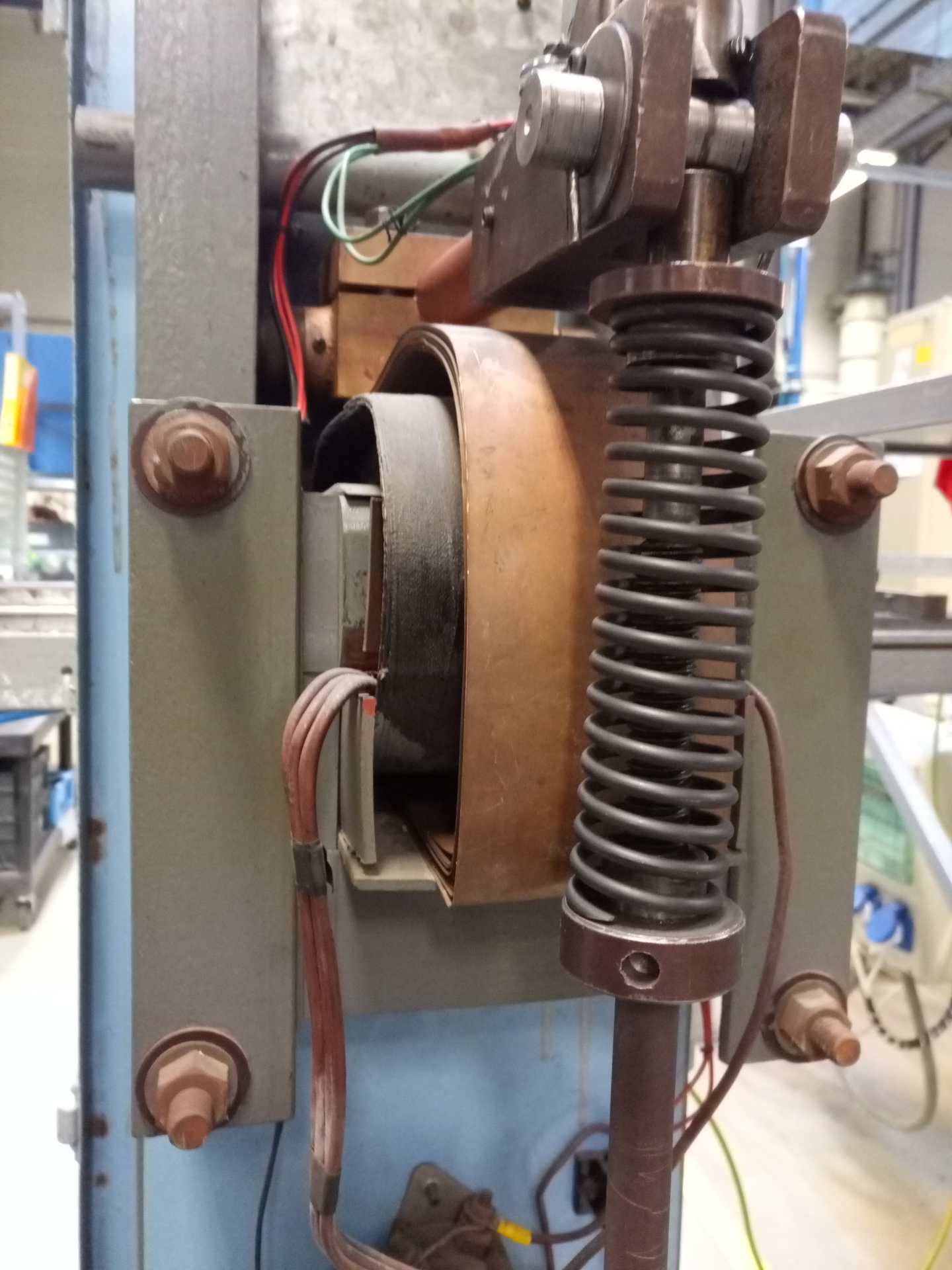 És így néz ki a trafója. Cirka 20x20 cm-es I/C vasmag. Mint látszik az I-n van egy primer...itt 400-415V-os és efelett egy szigetelés majd szekunderként egy rézlemezekből álló egy menetes kicsatolás. A Primer természetesen a kora miatt több középmegcsapolásos, és egy tárcsás kapcsolóval lehet 4-6 fokozatban állítani az áramot. Finombeállítást meg ugye a hegesztési idő ad.