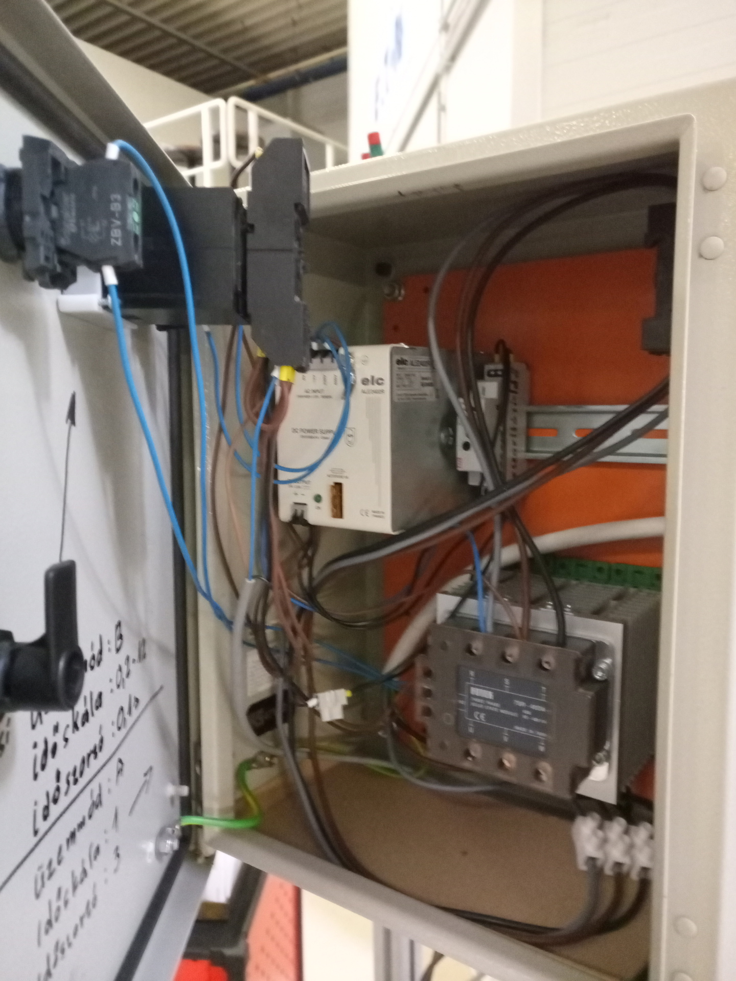 Belseje meg ennyi. A fehér egy táp..brutál, de ez volt kéznél. Kell, mert a 3 fázisú szilárdtestrelé 24V-ra indul. Amint látni belemegy fent a 3 fázis (szürke-barna-fekete) és ugyaninnen megy a táp ill. az óra tápja. Alul a kimenete meg már csak a két vezeték a trafónak. A szilárdtestrelé felett van még egy időzítő. Ez az úgynevezett zárási időt adja.