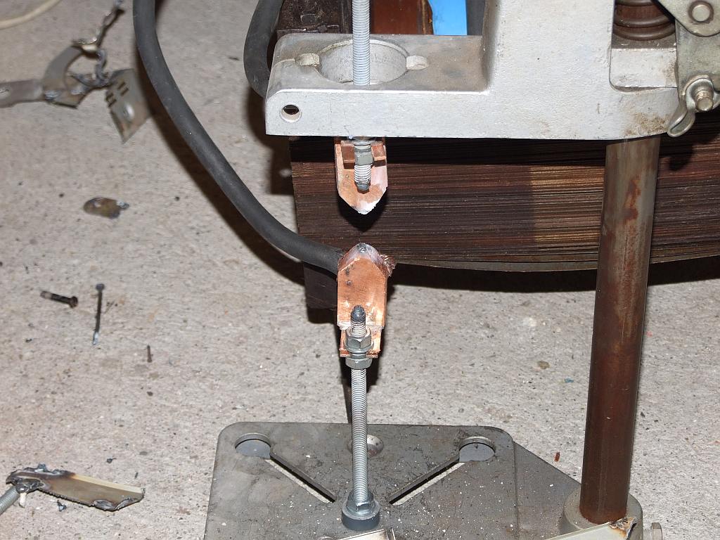 A trafódat fordítsd be az állvány háta mögé, hogy a kábeleket minél rövidebben lehessen vezetni. Nem rossz az a hegesztőkábel, csak 5-6 db kellene belőle párhuzamosan. Ha fixen egybeépíted a trafót az állvánnyal, a stabil elektródához réz sínnel is viheted az áramot, elég, ha a mozgó kapja többszörös kábelen.
