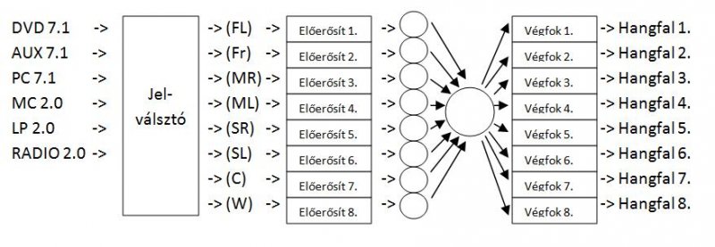 Te valamit kicsit keversz. Akarsz építeni egy "erősítőt", amivel nyolc csatornát tudsz szabályozni, erősíteni, mindezt két hangfalra? Gondolom ezt akarod, akkor neked kell nyolc előerősítő, majd egy keverő, és egyetlen végfok. A keverő feladata, hogy egyenként (csatornánként) és egyben (master hangerő) is bírd szabályozni a kimenetet.