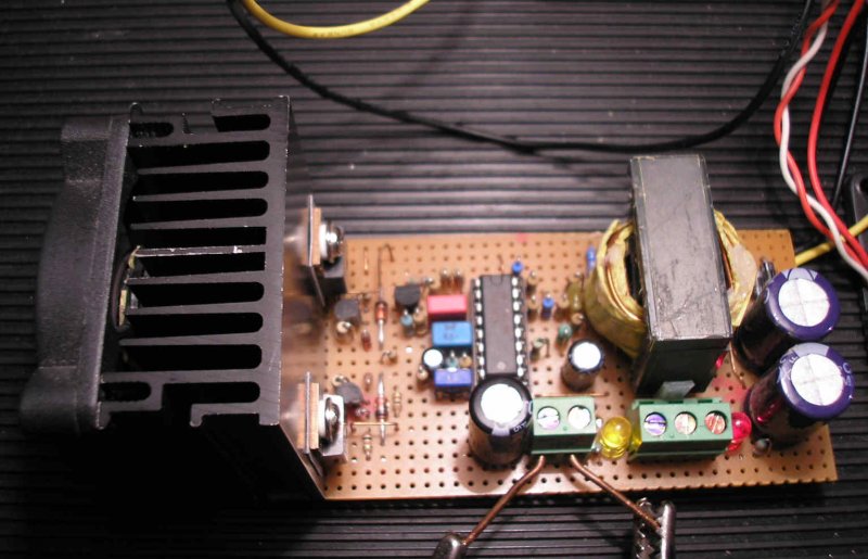 Azért gondoltam a PC táp trafóját itt alkalmazni, mert az szinte mindenki fiókjában megtalálható. A ferritgyűrűs trafó szintén jó megoldás, de elég nehéz megfelelő teljesítményű toroidot beszerezni hozzá. Ráadásul, a PC trafója az azonnal felhasználható, nem kell tekercselni sem. Vannak kisebb méretben is PC trafók, ahány típus van belőle annyi fajta található. Ezen kívül, a tekercsek áramterhelhetősége is megfelel minden követelménynek. Én biztosan ilyen megoldást fogok alkalmazni nagyobb teljesítmények átvitelére, mert egyszerűen el lehet készíteni az áramkört. Itt szerintem egyelőre még nem olyan fontos, hogy ”benne” legyen az órába ez a táp, lehet az egy külső egysége is. Természetesen, több megoldást is ki kell próbálni, mielőtt kialakulna a végleges áramkör, ám ezt mindenképpen a megfelelően elkészített forgótrafóhoz célszerű összeállítani. - Jól működik a PWM szabályozása a kísérleti áramkörömnek, a teljesítmény felvétel növekedése, vagy csökkenése jelentősen változtatja a bemenő áram mennyiségét. (Ha a terhelt forgórészt kiveszem a forgótrafóból, azonnal leesik a bemenő áram, ez nagyon tetszik. A visszacsatolás kiválóan dolgozik.) - Itt egy igen kis PC trafóval megépített DC-DC konverter.