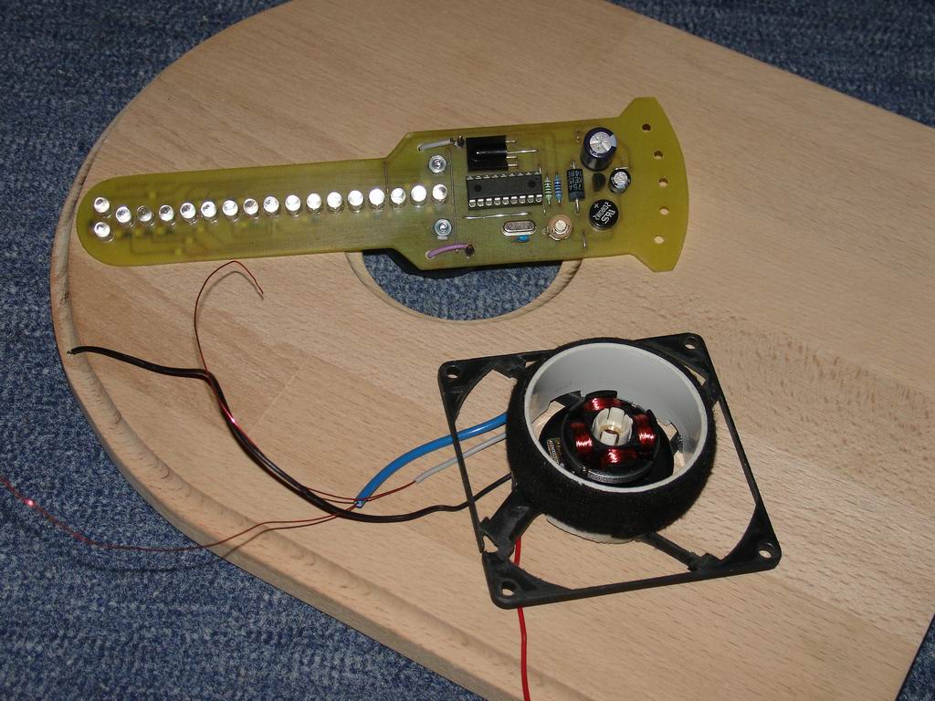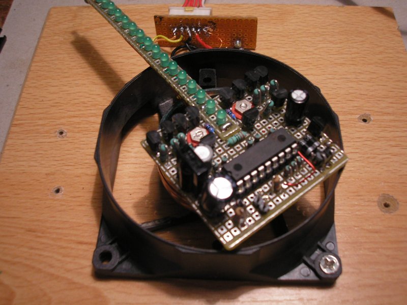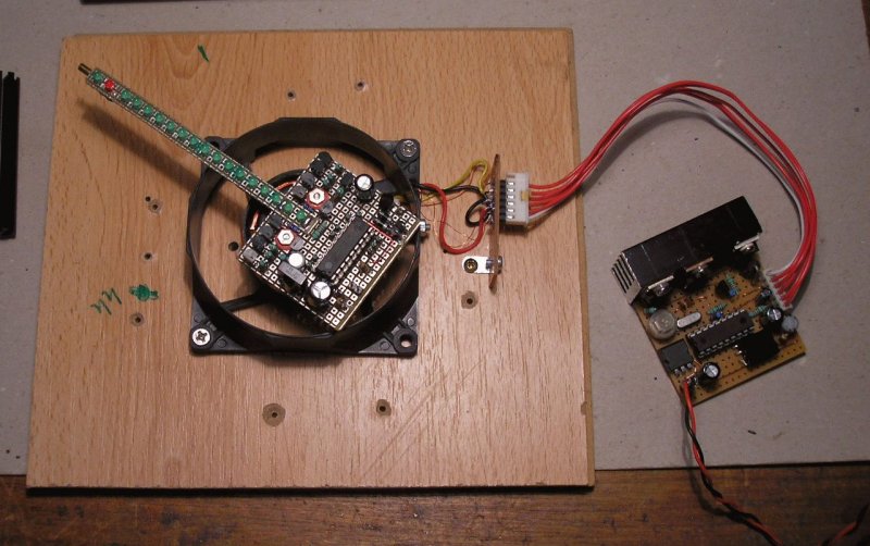 Megépitettem egy újjabb demó órát, de más eszközökkel. Normál 3mm LED-ekkel, ventillátor motorral. Nincs olyan jó és fényes mint az első, de ezt kizárólag kisérletezéshez használom. Az LM2941 helyett egy bövített áramkört készitettem el, amelynél nem kell a bazis programot megváltoztatni vagy átírni, úgy müködik mintha 2941-es lenne. (Nekem sem sikerült rendelni most ebböl). A rajzát csatolom. és néhány képet az óráról is.