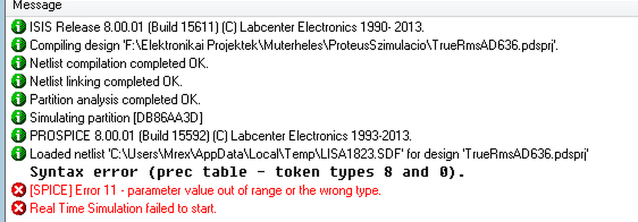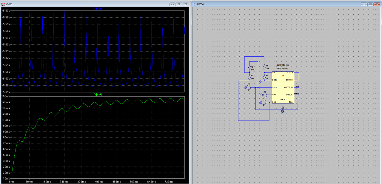 Egy AD636 ot próbálok működésre bírni Proteusban. mindent a súgó alapján csinálok, a model mégsem működik. Viszont ugyanez a model teljesen jól működik LTspiceban. Úgy érzem, valami apróság van itt a háttérben.