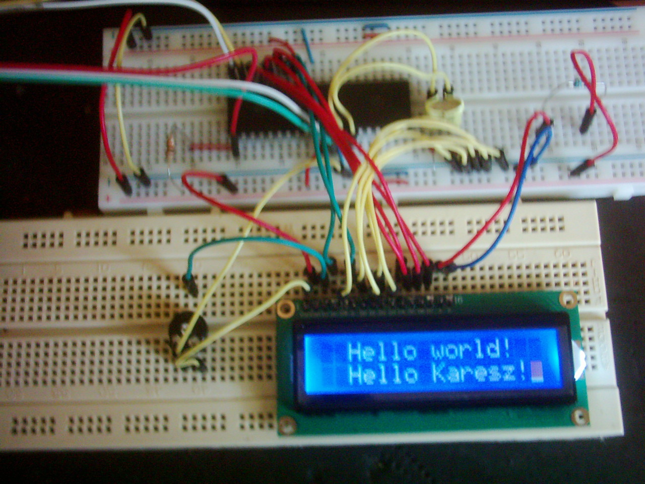 Amikor a potmétert beletettem, már látszottak a karakterhelyek de a karakterek csak egy 4Mhz kristály bekötése -- a 16f877a 13 -14 lábakhközé 2 db 22 pikós kondival a testre -- után látszottak.
