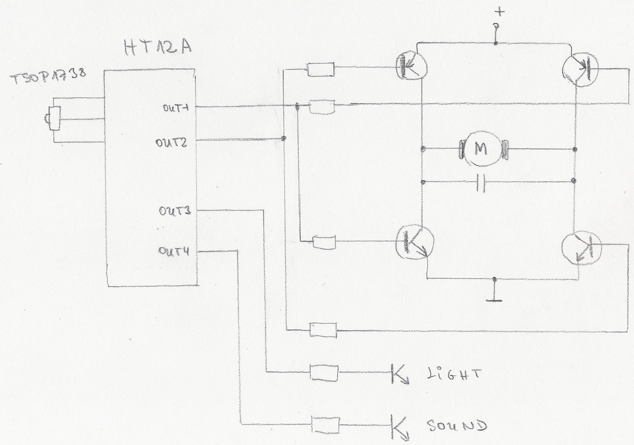 Csináltam egy nagyon sematikus bekötési rajzot IR vezérléssel egy DC motorhoz. Valamit hozzá kettő független kimenetet. Mit szóltok hozzá, működhet ez így?
