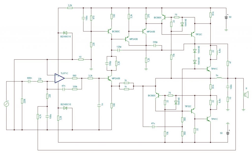 Melyik műveleti erősítőt raktad bele? Csak az LM301 nél kell a 220 ohm-os ellenállás ami a zenert földeli, minden más esetben ott rövidzárat kell alkalmazni. A műveleti erősítő kimenetére kötött 1k8 ohm-os ellenállást pedig csak akkor kell berakni, ha a kimeneti teljesítményt csökkenteni szeretnéd 30-40W-ra. A torzítás forrása pedig a B osztályú tranzisztorok túl kicsi bétája lehet. Üdv Pioneer Valahogy így.