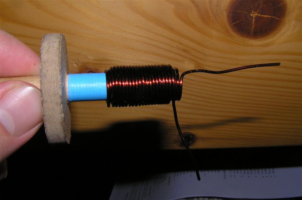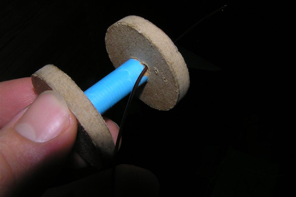 Én a 3uH-s tekercset 10es fúrószárra szoktam tekerni, és ha beforrasztom a nyákba, akkor már tuti nem rugózik szét. A másikat a képen látható kis segédeszközzel szoktam elkészíteni, ami egy tipliből és két kis MDF korongból áll. Biztos lehetne szebbre is tekerni vele, de ezzel nagyon gyorsan elkészül. (Ha nem kellett volna közben fotóznom, akkor is szebbre sikerül, mert a vezetéket itt is szorosan kell húzni egymásra.)
