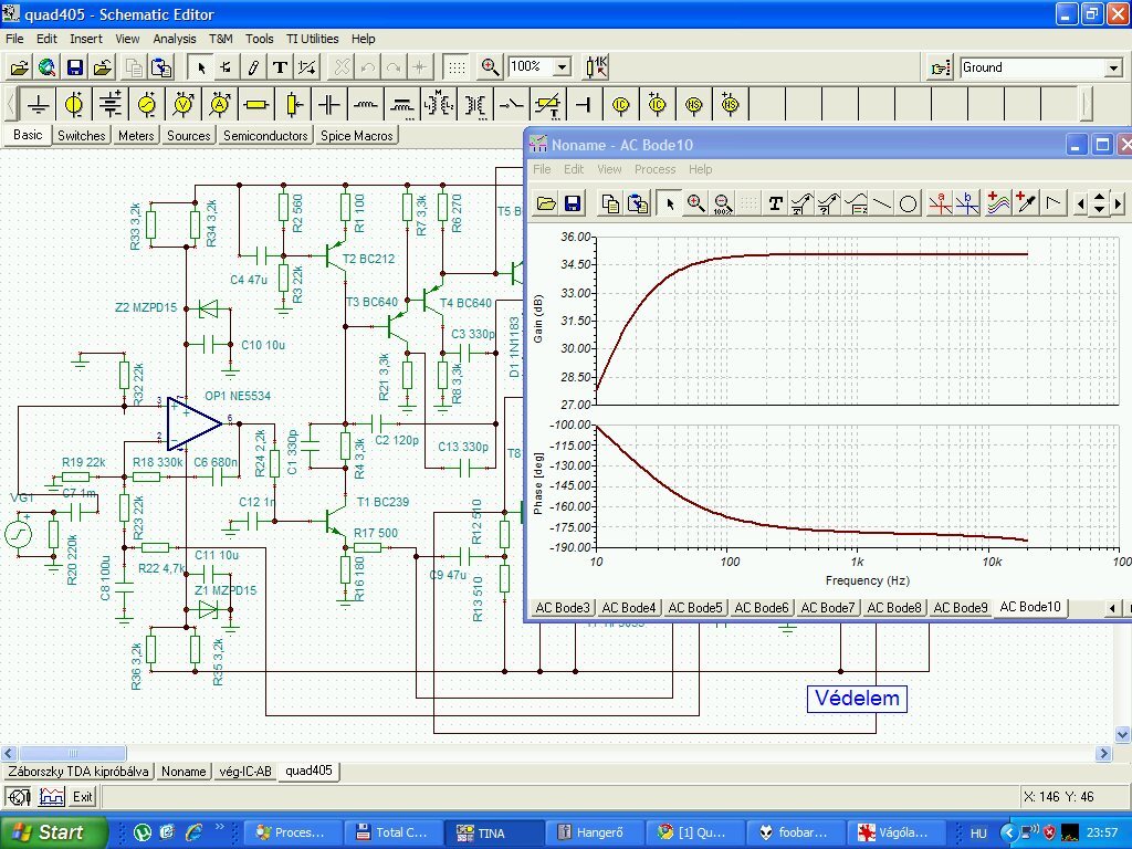 Csakhogy ez egy zérus, azaz ettől a kiadódó frekvenciától kezd el nőni az erősítés, mégpedig 20dB/dekád meredekséggel. Addig nő, amíg el nem éri a a 330k/22k által beállított erősítést és ez viszont 20Hz fölé adódik ki. Tehát ahhoz, hogy a kapcsolás a 47nF nélkül átvigyen 20Hz ig, hatalmas kondenzátor kellene, ami persze nagyfrekvenciásan nem eléggé hidegít ( eléggé jó pedig nem létezett a kapcsolás tervezése idejében). A másik megoldás pedig a 4,7k emelése lett volna, csakhogy akkor meg az offszet elmászik. Ezért a Quad zseniális tervezője azt választotta, hogy 330k/22k -val beállított erősítést adó tagokat kiegészíti egy mélyt emelő kondenzátorral, nos ez lett a 47n. Nagyobb kondenzátor alacsonyabb frekvenciájú töréspontot ad ehhez a mély emeléshez, tehát kisebb lesz a mély emelés, azaz nem kompenzálódik a relatív kisebb értékű 100µF-os hidegítő kondenzátor mély vágó hatása. Az időállandókat úgy választotta meg, hogy kis impedanciás generátorról lineáris legyen a frekvencia menet 20Hz-ig. ( ugye a 405-ös elé járt egy előerősítő, ami tudta ezt) Az ábrán látható a szimuláció eredménye 680nF-al, látható a durva mélyvágás, tehát hagyjuk meg a 47nF-ot. A másik ábrán a Quad átvitele látható, de most a mély emelő kondi nélkül, látható, hogy a mély emelő kondi nélkül vágja a mélyeket. A hozzászólás módosítva: Ápr 27, 2013