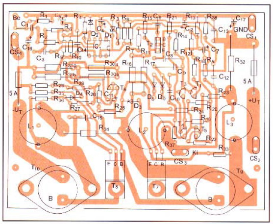 A T5 és T6 tranzisztorok akkor nyitnak ki és korlátozzák az árramot ha a bázisukon 0,6-0,7 volt jelenik meg ehez az áramfigyelő ellenálásokon ennek a kétszerese kell a fesz. osztás miatt: 1,3 V körűl, ehez 13 A kell 0.1 ohm esetén. Az R25 - R29 ellenálások szerepe pedig az hogy az áramkorlátozást mértékét a tranzisztorokon eső feszűltség fügvényében módosítsák (tovább csökkensék)