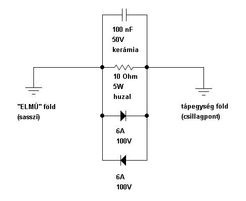 Ez pontosan így van. És ebből a pontból csatlakozik a hálózati földre is. "A legjobb megoldás az, ha 10ohm 5W párhuzamosan vele 100nF és ezekkel párhuzamosan két szembe fordított dióda." Ezt nem teljesen értem, hová kellene ezt beépíteni? Köszi, Szabolcs
