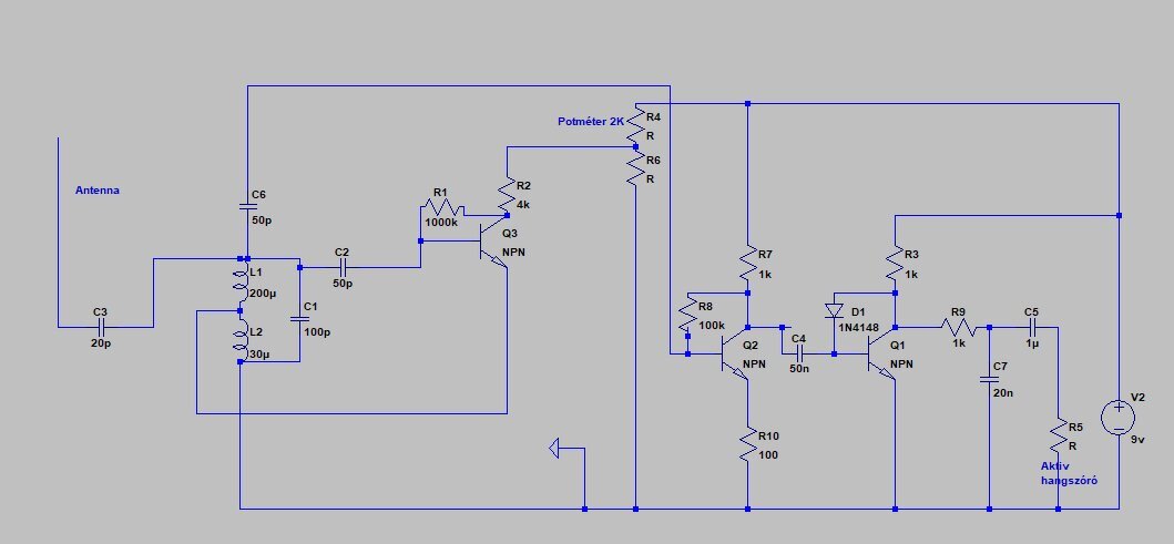 Ez nem regeneratív vevő, hanem egy egyenesvevő q sokszorozóval. A rezgőkörre az antenna egy leágazáson át csatlakozik. Az jfetes q sokszorozó jfet-je közvetlenül rá van kötve. Az energia a tekercs ferritrúdjára egy tickleren keresztül (Armstrong) jut vissza, ami 2-3 menet közvetlenül a ferritre van rátekerve, merevebb drótból. A potméterrel a Q1 jfet tápfeszültségét szabályozzuk, ezáltal erősítését is. Q2 az egyenesvevő rész RF erősítője, Q3 a D1 diódával az AM detektor. A D1 dióda nem tudom, nem fordítva kell e. A hozzászólás módosítva: Okt 29, 2025
