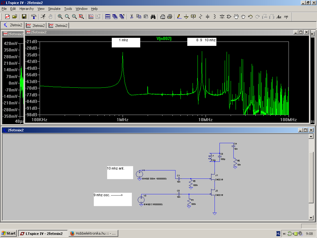 előbb található, bár ez hibás. Lemaradt róla a táp, és a rezgőkört is egy 1k ellenállással helyetesítettem. Az antenna és föld közzé egy kb 5 mH tekercset tettem az 50 hz-t szűrni. A keverőre kötöttem az oszcillátort, amivel KH frekvenciás jelet vezettem rá. Az 1k s ellenállás alatt a kimenetet 10n val csatoltam egy drótra, amit a földre kötöttem. Ezt a drótot rátekertem a Conrados AM radió ferritrúdjára, de csak 1 menetet. Képzeljétek el működött. Az oszcillátor hangolásával lehetett hangolni középhullámon(szólt). Ha alacsony frekvenciára vittem az oszcillátor, ahol nem bírta sípolt, majd a Kossuth rádió volt halható. (Gondolom ekkor nem járt az osc.) Különös azonban, hogy amikor a ferritrúdra kötött drót helyére aktiv pc hangszórót kötöttem azon is működött, hangolható AM rádióként! Ez gyanús mert a pc hangszóró nem egy KH frekvenciára érzékeny, (mint az AM rádió) hanem az összeset egyszerre megszólaltatja. A hozzászólás módosítva: Feb 9, 2018
