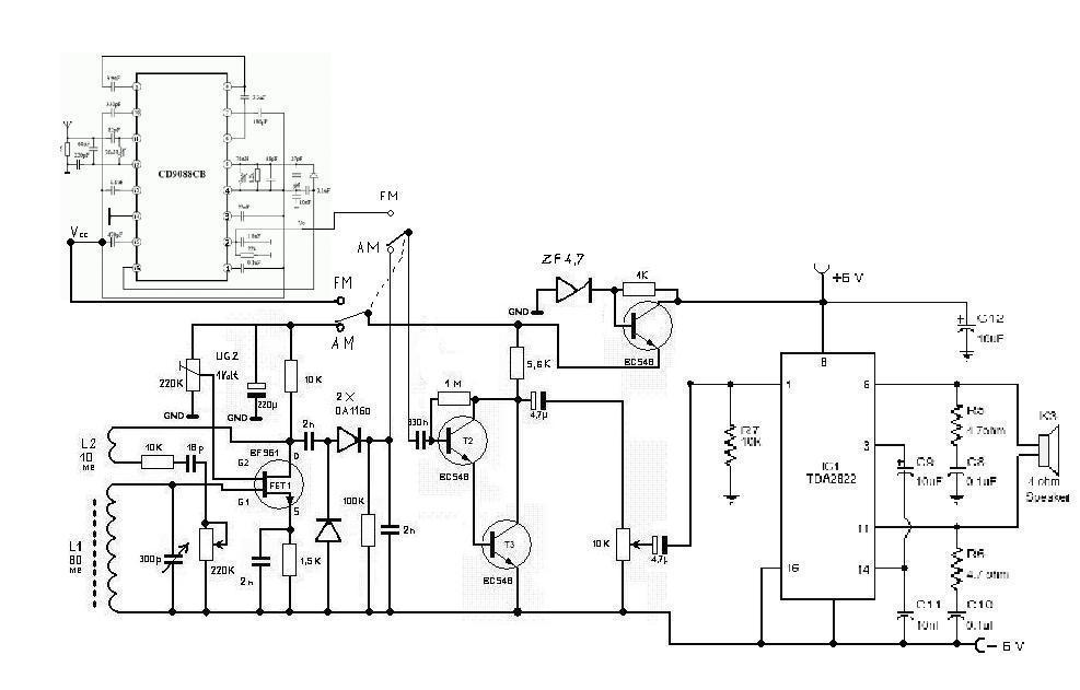 Én is úgy gondoltam, nem szenvedek többet ezekkel az egy tranzisztoros vacakokkal. Legalább megtudtam, mit tudnak? Megtaláltam a már rossznak hitt CD9088-as panelt (A TDA7088 klónja). Sikerült felélesztenem, úgy tűnik semmi baja. Biztos valami leszakadt, amikor rossznak hittem. Akkor ez lesz az FM rész a rádiómban, (Akkor már lesz ilyenem megint három) a végfokot meg TDA2822-re cseréltem benne, hídba kötve. Az a tranzisztoros vég is csak próba volt, nekem nem jött be azokkal az ellenállásokkal, amiket írnak bele, úgy 120 mA volt a nyugalmi árama, ezért növeltem meg benne az ellenállásértékeket, lásd a rajzomon, de ekkor fullad teljes hangerőn, ez a kis IC teljesítményre sokkal többet tud, ráadásul van is itthon.