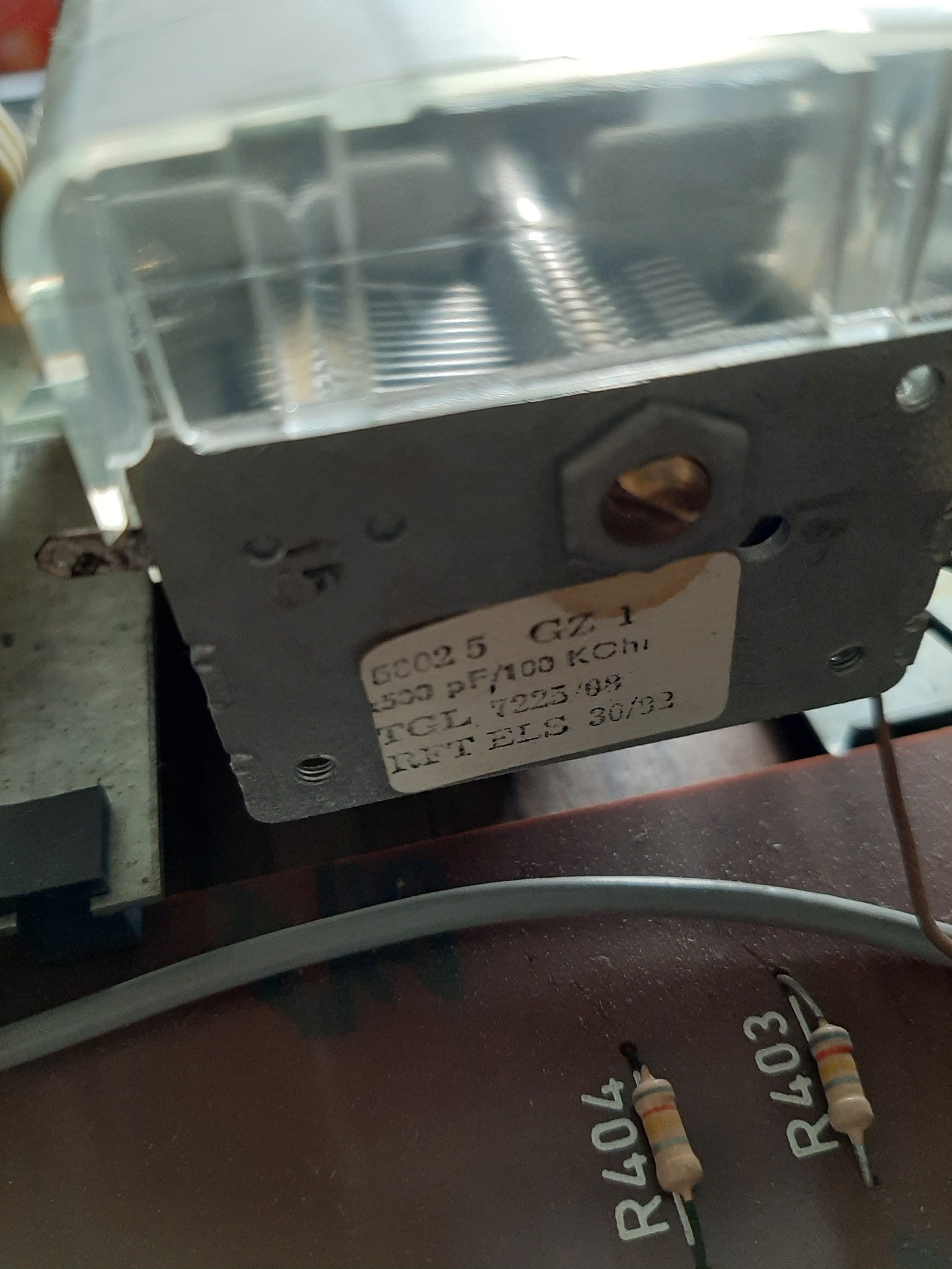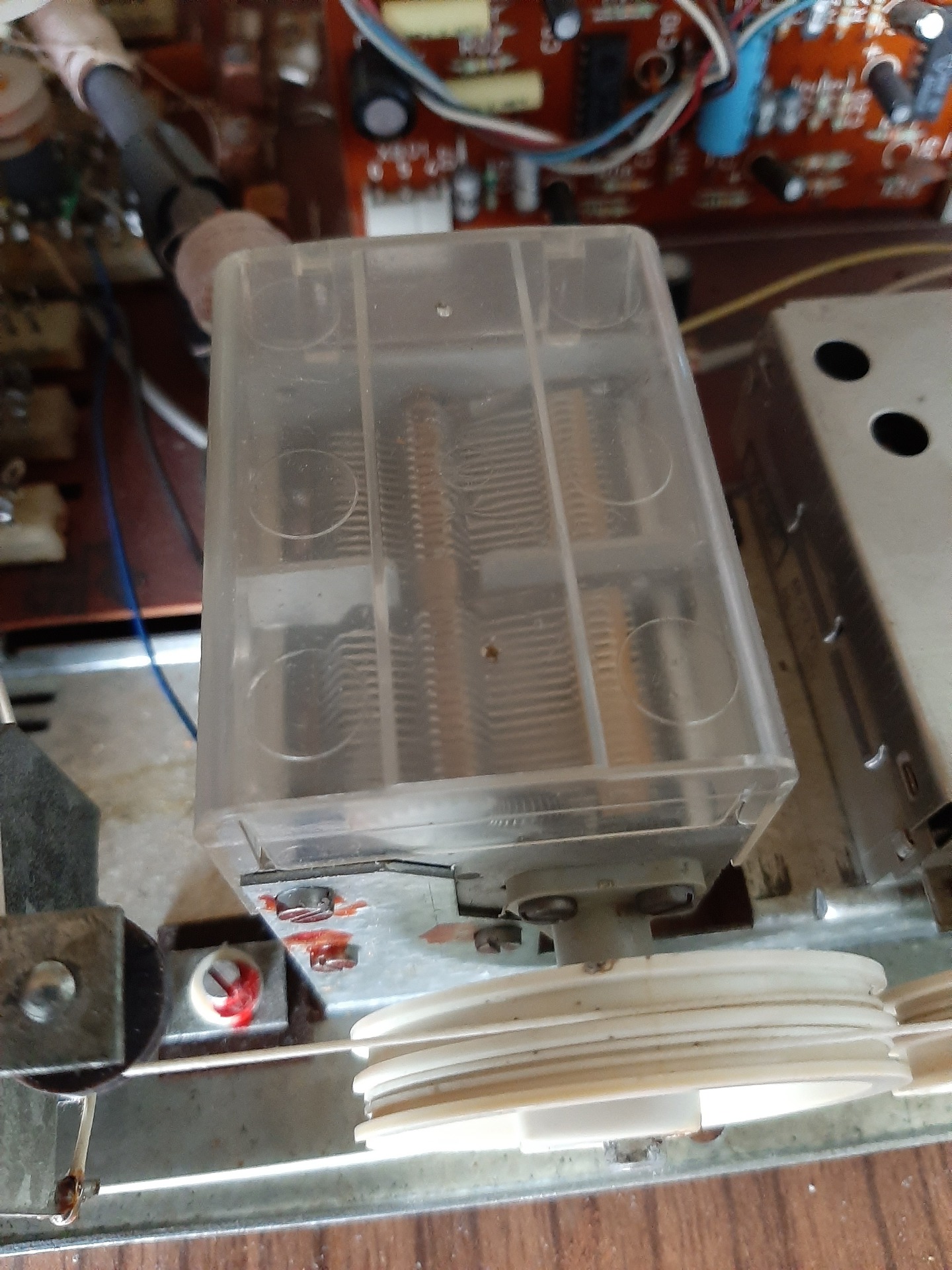 Nosza kivettem a dobozából (kávájából?), hát a 2.-3. képen látható forgókondenzátor volt beragadva. Elkaptam a tengelyét fogóval, nehezen megindult, vagy 25-30szor áthajtottam előre-hátra, mostmár bírja a skálahúr mozgatni.