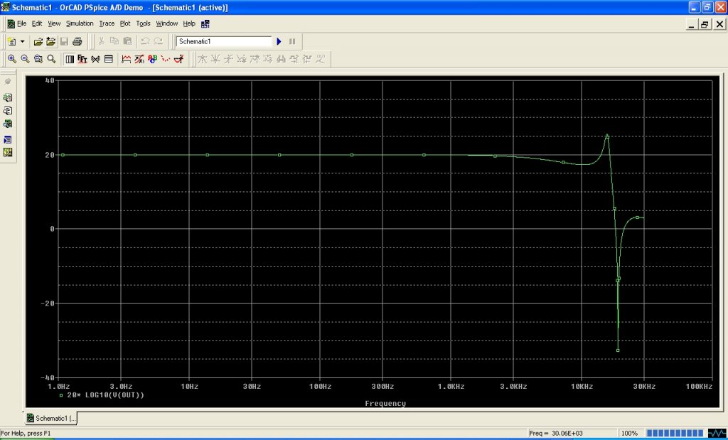 a kisebbik tekercs mérés során 1,8mH körül, a nagyobbik pedig 21mH körül mozgott. Tehát a gyári adatok: 1,7mH és 21,5mH ezekszerint. Leszimuláltam azt is, a már mért RDC-t belekalkulálva. A sávzáró pont így már valóban 19k környékén van (19,2kHz), de az átvitel még így is elég érdekes (lásd ábra).A tekercseket úgy hagyva, DR14-DR17-et 2,2k-ra módosítva, DC11-DC31-et 4,7n-ra módosítva már alakul a kép (modositott.jpg)