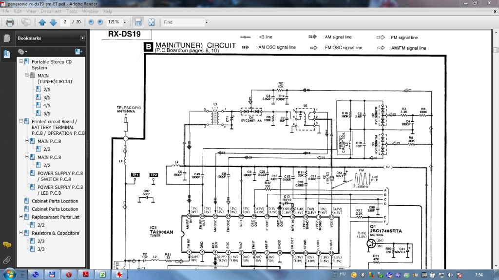 Egyszer már 2010-ben volt gond a Panasonic RX-DS19 cds-rádiós-magnóm PLL-jével. Akkor X3-as Quartz volt a hibás, nem adott órajelet a PLL szintézer IC-nek. Most is hibás lett a készülék. Megnéztem X3-as quartzot is, az egyik vége adja a kb.7.2MHz-es jelet. A másik végének is adnia kellene? Hiba jelenség: - Leválasztottam a PLL-t a varikapoktól (lásd. RX-DS19-Leválasztás.jpg) és potit tettem a rajz szerint, hogy kipróbáljam, hogy jó-e a tuner A tuner egyszer jó. egyszer nem. Ha jó a tuner akkor az L5 nyomtatott tekercsen mérem az FM frekit, ha nem jó, akkor meg kb.300kHz-et, annyit ami X2-önél van. Mikor a V mérővel méregetem D1, D2 pontokat, akkor szokott átkapcsolgatni a jó, és a rossz módba. Sőt mikor erősen nyomom a mérőcsúcsot, akkor változik. Érdekes. - Hiába kapcsolom FM/AM váltó nem működik, ha jó a tuner, akkor is FM szól. Amit fogok csinálni: - PLL IC-nél sem változik a fesz, bár ezt még pontosan mérnem kell, tehát valószínű 2 hiba van A hozzászólás módosítva: Okt 1, 2012