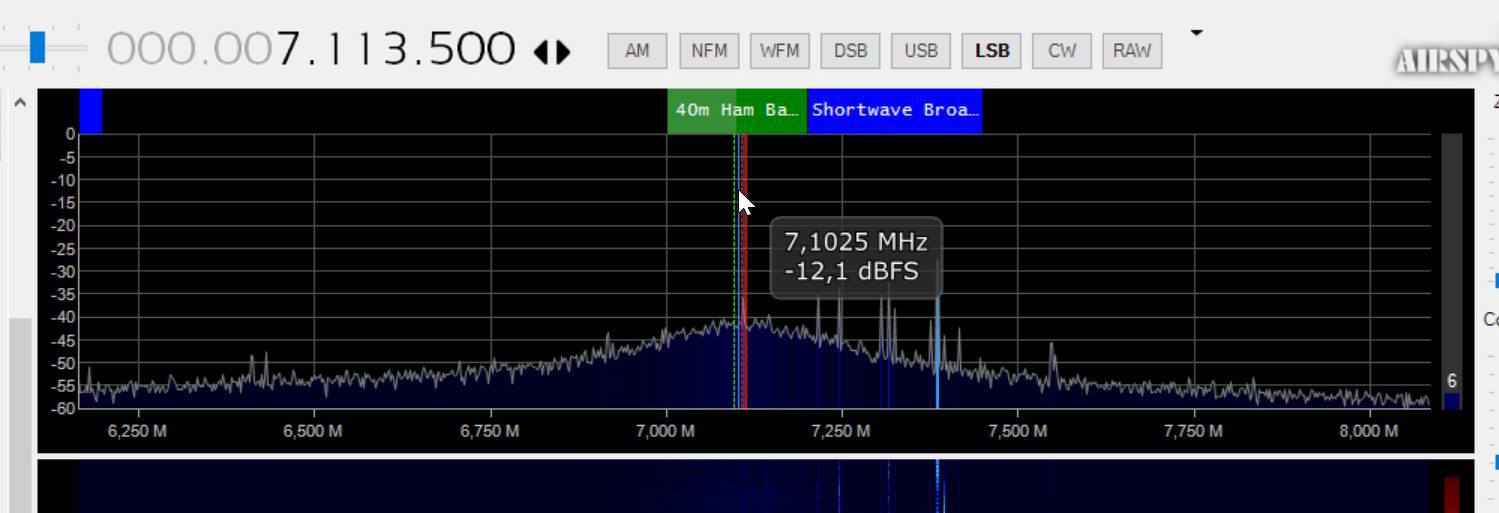 6798 kHz , kb 10 kHz sávszélesség. Összesen 3 frekvencián ment szinkronban - legalábbis az amplitudó, a legalacsonyabb frekvencia 6500 kHz körül volt. (Nagyjából látszik a videón) Ma reggel csak 6640 kHz-en ment.