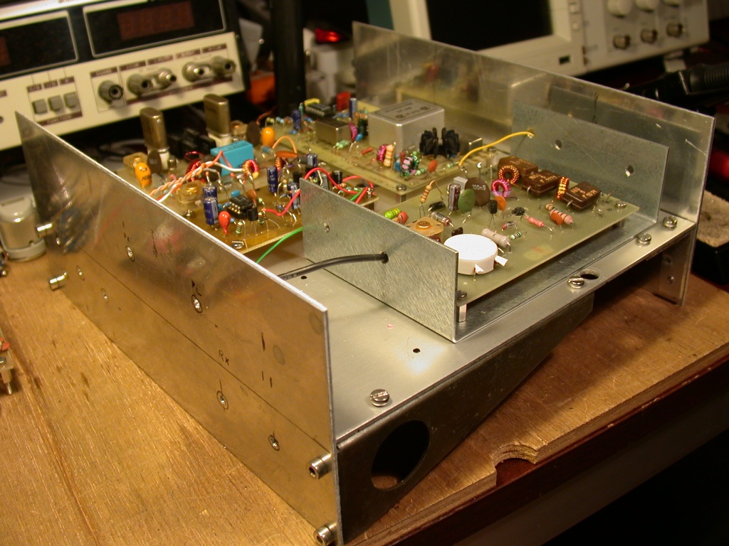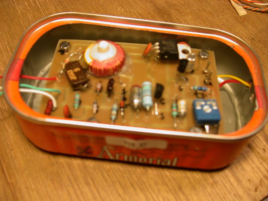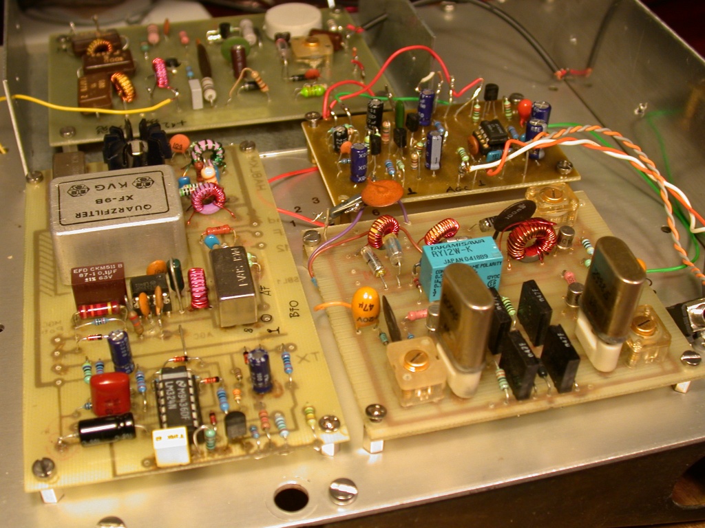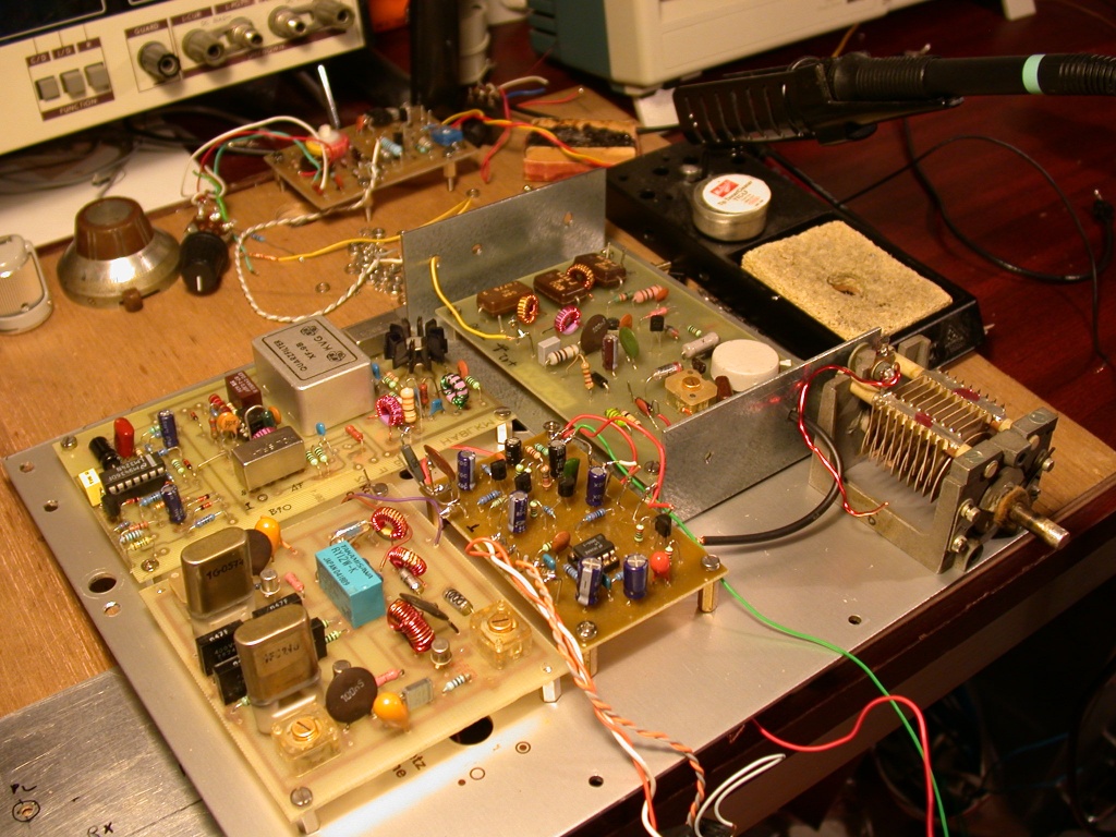 Bár lehet, hogy maradok a kb. 1W körüli teljesítmény mellett, mert 5Wattal nem kunszt QRP-zni. Tavaj egy 200miliWattos kis transceivert készítettem és közel 200 QSO-t létesítettem vele a HA QRP aktivitás idején. Most a vevőt szerelem a sasszira a képen a KF panel látható a DBM-ekkel és az AGC fokozattal. A konzerves dobozban pedig egy jó stabilra sikerült VFO van.