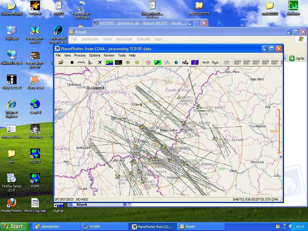 Ma kint voltam az udvaron. Felraktam a donglehoz kapott mágnestalpas "antennát" az ereszcsatornára, hogy függőlegesen álljon. Nagyon szépen jöttek vele az ADS-B repülőgépek. Dél felé jobb volt valamivel, mert északfele árnyékolt kicsit a tető. Néha volt olyan, hogy a Planepotter némely gépek köré köröket rajzolt, de utána eltűntek. Az utolsó képen látszik. Próbáltam rájönni, hogy mi az, de nem sikerült. Ha valaki ismeri ezt a programot, lenne szíves felvilágosítani pár dologgal kapcsolatban?