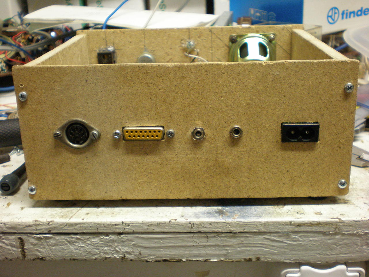 A hangszóróra gondolsz? Az elé megy egy díszlemez, de nem találtam itthon ide passzoló darabot eddig. Ezt a fránya préselt fát meg nem lehet úgy fúrni hogy szép legyen a lyuk pereme. Ezért döntöttem a díszrács mellett, csak még nem találtam megfelelőt.