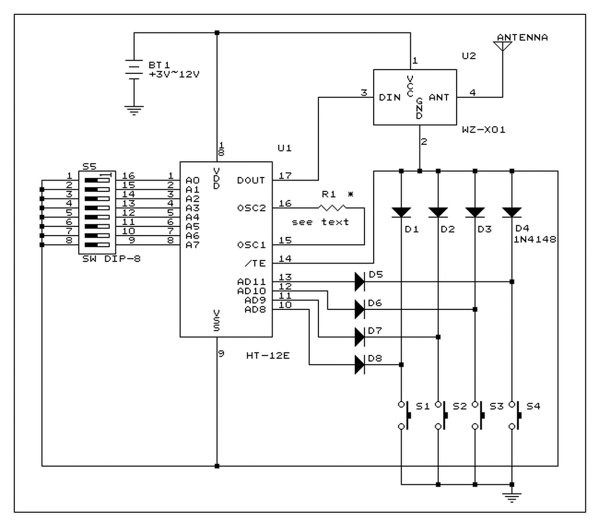 Leírom a tapasztalatokat a HT12 párossal és a Kínából rendelhető, olcsó RF modulokkal. Pár bejegyzéssel följebb, láthatjátok a képeket a modulokról, párszáz forintért rendelhető. A HT12E kódernél, az alap beállítást választottam, vezérléskor az adott bemenet testre zár. Felhúzó ellenállásra nincs szükség. Ha azt szeretnénk, hogy az RF adó ne egye az energiát állandóan, használhatjuk a diódás kiegészítő kapcsolást, csatolom a rajzot. Az adó részt 9 voltról járatom. A vevő egységnél ügyelni kell rá, hogy az RF modul és a dekóder IC, közös 5 voltra kerüljön. Két napig kínlódtam, mire rájöttem. Pedig az adatlap szerint, 12 voltig jónak kellene lennie. Jó is, RF modul nélkül. A vevő egységről. Ha a HT12D dekódert fesz alá helyezzük, a kimeneteken állandó alacsony szint lesz. Ez csak addig tart, míg az adót be nem kapcsoljuk. Ilyenkor beállnak magas szintre. Ez az előbb említett testre kapcsolós adó verziónál van. Innen viszont, szépen működik a kapcsolás. Ez egy áramszünet esetén viszont gondot okozhat. Átalakíthatjuk a kapcsolást, vagy az adónál, magas szintre kapcsolással, vagy a vevőnél, hogy a kimeneteket a test, vagy a táp felé terheljük. Az eredmény vagy minden led világít és kapcsolásra alszik el, vagy rendesen működik, de aktív adó nélkül, állandóan világítanak bekapcsoláskor. Persze ez egy példa, ha ledekkel hajtom a kimeneteket. A megoldás, a signal kimenet használata. Amíg nem látja a vevőt, addig a signal kimenet alacsony szinten van. Ha a vevő hatókörbe került, magas szintre vált. Mellékelek egy rajzot, ahol ledeket, reléket lehet meghajtani és bekapcsoláskor nem indulnak be, kikapcsolt adónál sem. Sok sikert az építéshez, remélem sokak munkáját megkönnyítettem ezzel. |