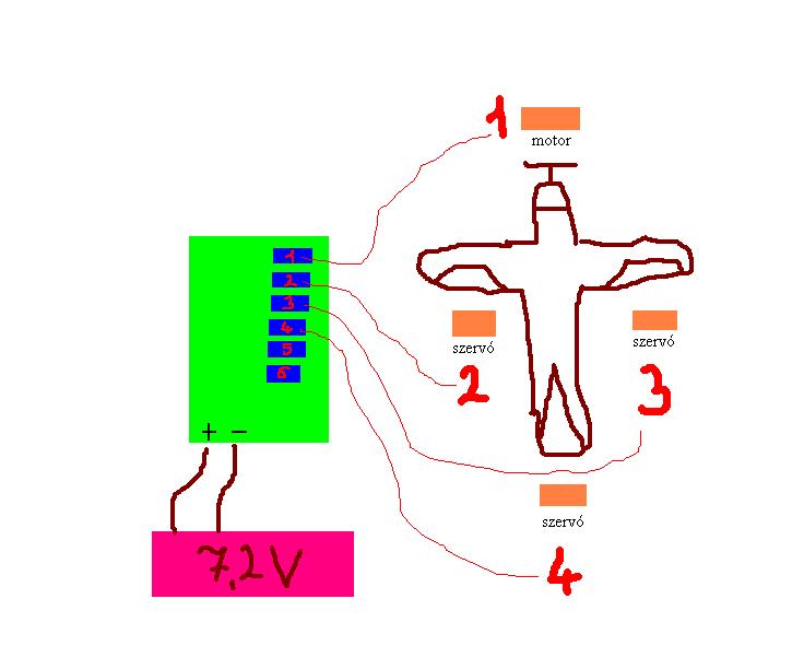 sorban.... 1 rádoóadó , lehetőleg minimum 4 csatornás 1 vevő ami hozzá tartozik. 1 akkumulátor ami energiát ad a motorszabályzónak, mondjuk 7,4V A motorszabályzóban van egy olyan belső feszültségszabályzó, ami visszaad 5V feszültséget a vevőnek, és a többi szervónak,( a 3eres vékony vezetéken) tehát nem kell félni a túlfesztől.... (gyakorlatilag rádugod az akksit a motorszabályzóra, a vezérlő vezetékét a rádióvevőre, és azon a vezetéken keresztül kap a többi szervo is feszültséget, amit beledugsz a vevőbe. Általában a kiosztás: 1. csatorna csűrőkormány 2. csatorna magassági kormány 3. gázkar 4. oldalkormány A csatolt rajz egy elég jó tulajdonságú gép,fűről, vízről,hóról felszáll... üdv. : Foxi