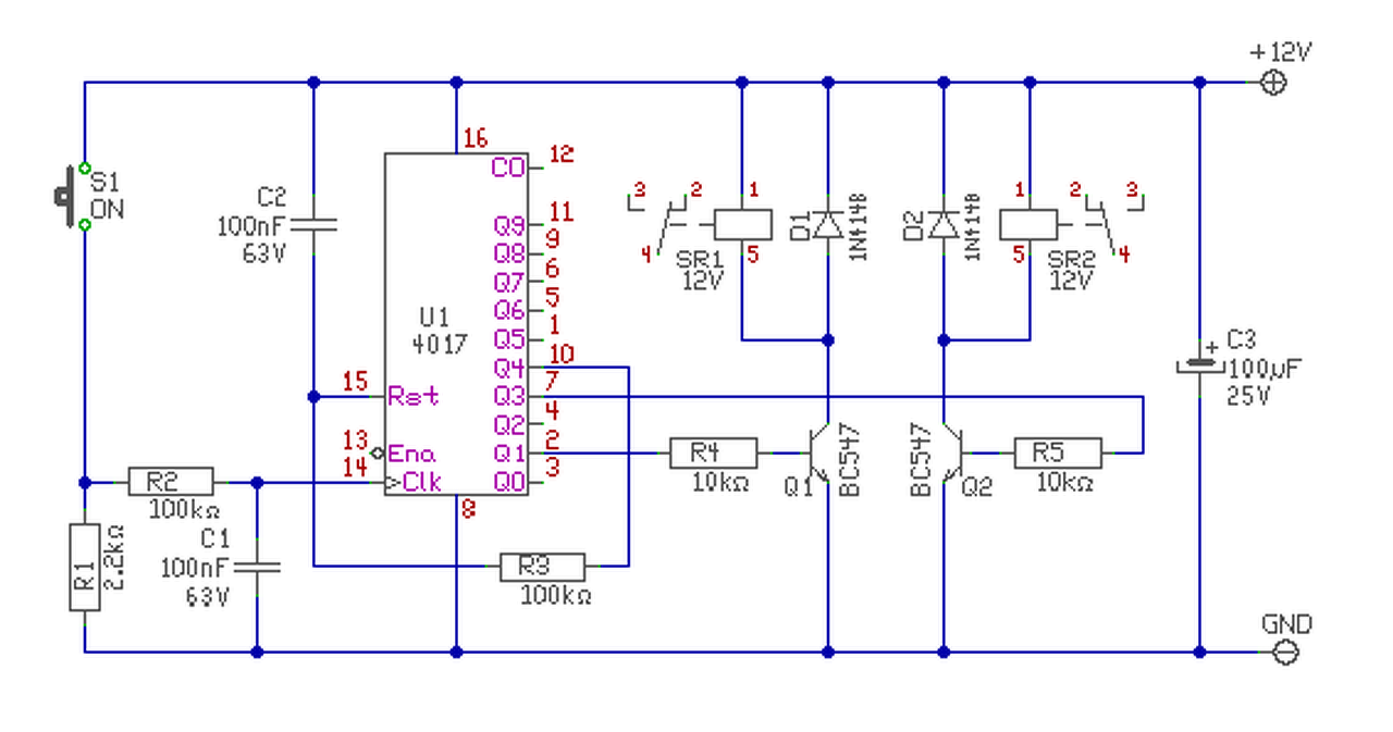 Szeretnék egy kis segítséget kérni, két relét szeretnék egy nyomógombbal, úgy hogy alapban mind a két relé nyugalmi állapotban legyen.A első gombnyomásra az egyik kapcsoljon be .A második gombnyomásra kapcsoljon ki, majd a harmadikra a másik relé kapcsoljon be és így tovább.