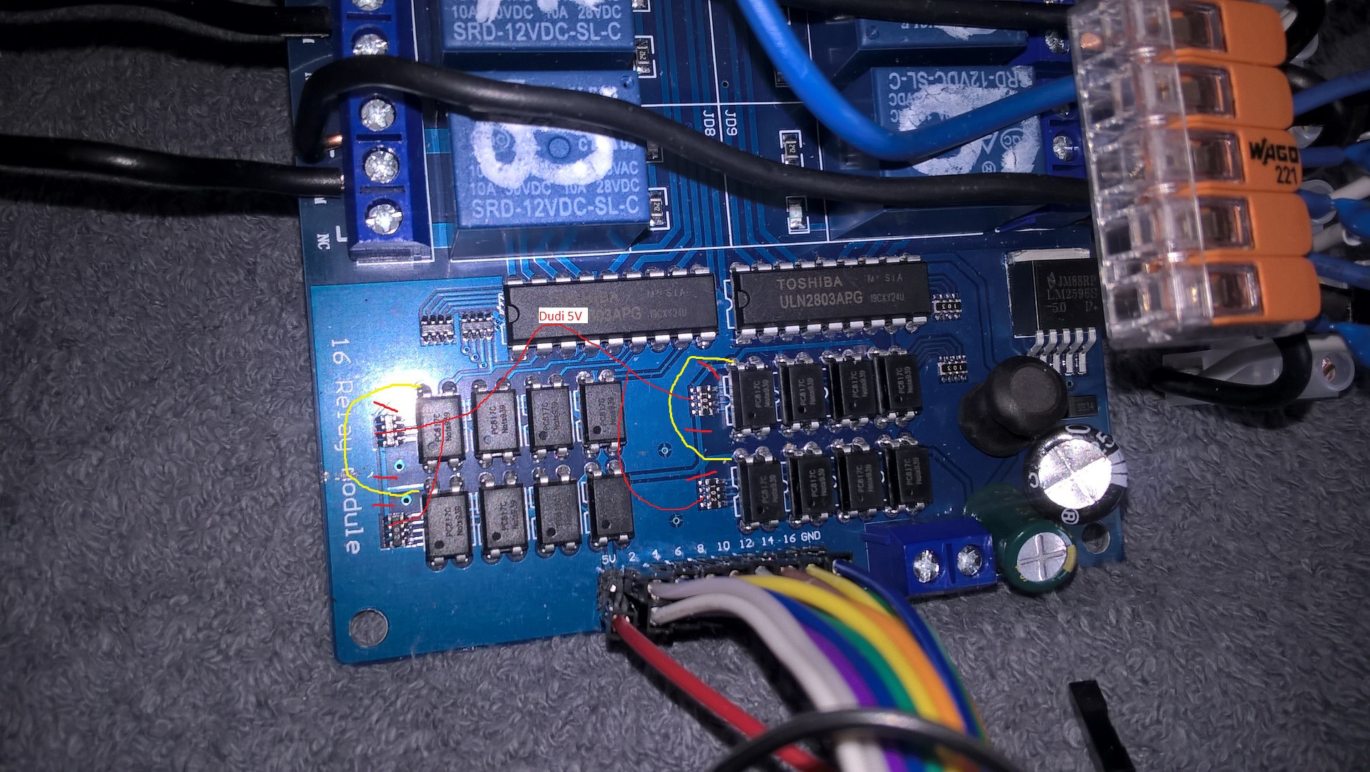 Vásároltam egy 16-os relé panelt innen a hestore.hu -ról. Bővebben: Link Kiderült, hogy a rajta lévő tápot összekötötték az opto csatolók bemeneti oldalával is! (A pin-eken megjelenik az 5V, és az IN1..IN16 tüskékre negatívot kell adni, hogy behúzzon a relé.) Arduino-val szeretném összekötni úgy, hogy ne legyen közös a negatív. (Azaz, hogy az opto-csatolóknak legyen értelme.) (Mellesleg redőnyvezérléshez akarom használni, itt a teljes topik: Bővebben: Link) Milyen lábakat kellene átvágni / kiforrasztani? Mivel érdemes mindezt "házilag" kivitelezni? Köszönöm! Mivel a linken található adatlap meglehetősen nehezen értelmezhető, feltöltök pár jobb képet magáról az alaplapról: