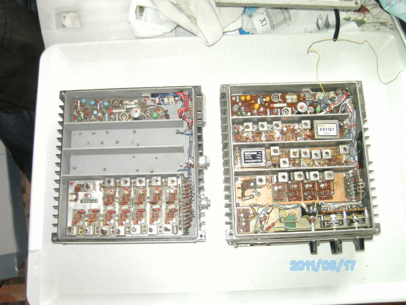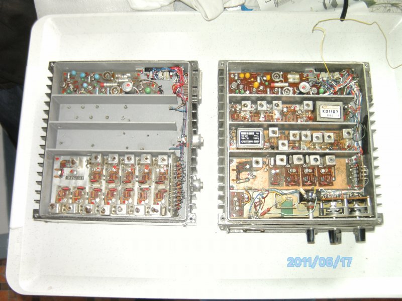 Szétszedtem a készüléket. A zajzár panel hiányzik belőle, illetve a vevő rész beázástól korrodált. Van mellette egy 24 Voltos inverter, de a kisérletekhez azt kihagyom. Nem tudom mit csinál a végfok 13 Voltról, de kipróbálom, végülis nem erőmű lesz. Úgy tűnik a 160 Megás verzió így arra számítok könnyen le lehet tekerni mindenét 144 re. A bemenetén található 4 körös sávszűrőhoz szinte biztosan wobbler kell.