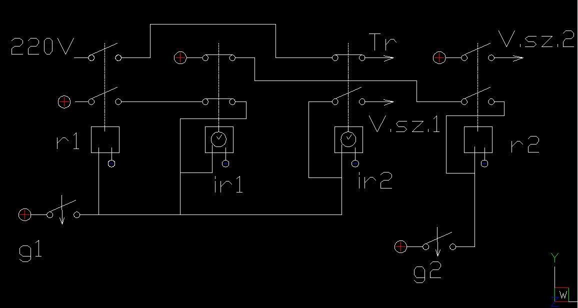 Csatoltam a kapcsolást. r1, és r2 sima relé, ir1 és ir2 kikapcsoláskésleltetett (a tápra adott feszültség után beállított idővel meghúz) időrelé, vsz1 és vsz2 vezérlőszelepek, tr egy darab trafó, g1 és g2 nyomógombok. Egy pneumatikus gépet működtet nagyjából így: ha megnyomjuk a g2 nyomógombot akkor r2 és vsz2 behúz, és úgymarad a ciklusidő végéig amit ir1-el állítunk be. g1 nyomógombbal indítjuk a ciklust, ekkor behúz r1 relé, és elkezd számolni ir1, és ir2, tr trafóra 220v feszültség kapcsolódik. ir2 időrelén beállított idő után Ir2 behúz, nyitja az nc kapcsát és tr lekapcsol és vsz1 áramot kap és a szelep behúz. Elvileg Ir1-en beállított idő letelte után szakadna az ir1 nc kapcsán az áramkör, és összes relé és vezérlőszelep elengedne, de ez nem történik meg, mert ir1 időrelé begerjed, mint egy kapucsengő. szerintem pár tized másodpecet késleltetni kellene a tápellátását. Tehát erre kellene a megoldás. köszönettel Árpi