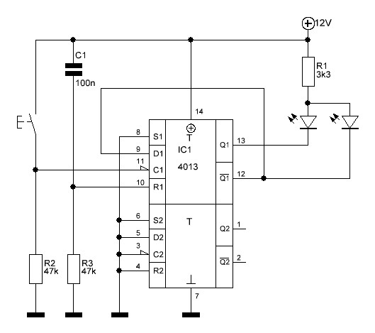 lenne egy kérdésem ha tudna valaki segíteni két ledet akarok kapcsolni nyomógombbal úgy hogy ha megnyomom akkor az egyik világítson ha megnyomom a másik gombot akkor elalszik a led és meggyullad a másik led gondolom kell hozzá egy relé de nem nagyon értek hozzá