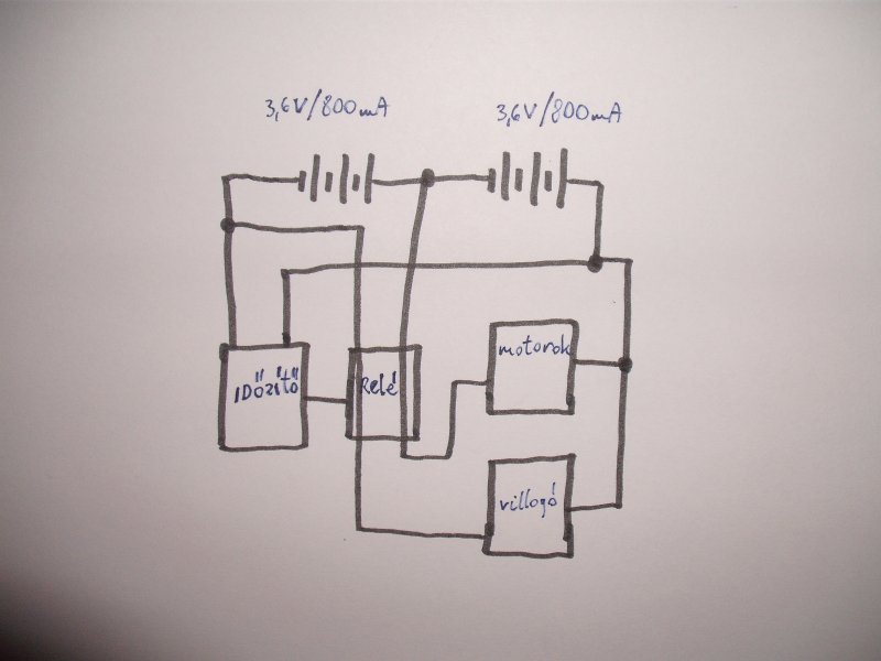 A trimmerrel esetleg lehet állítani az időt, vagy a villogást, a motor 'sebességét', stb. Ez durva vázlat, de mennie kell egy db 3.6V akkuról. Az összes alkatrész nem kerül 300Ft-ba. Most mennem kell, később visszanézek.