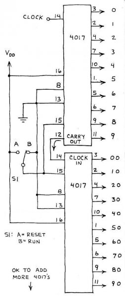 Nem lesz jó az áramkör, amit feltettél. Legkevesebb 3 db. 4017- es kell a megvalósításhoz. A probléma, hogy bekapcsoláskor resettől függetlenül a 0- ás kimenetek 1-be állnak, valamint, hogy a CO lábbal hajtod meg a következő fokozat CLK bemenetét. Bővebben lásd: adatlap. c4h10: Én is azt javaslom, hogy használj 4017- est, az adatlapban benne van a kaszkádosítás módja (5. oldal lap alja). Adatlap Üdv.
