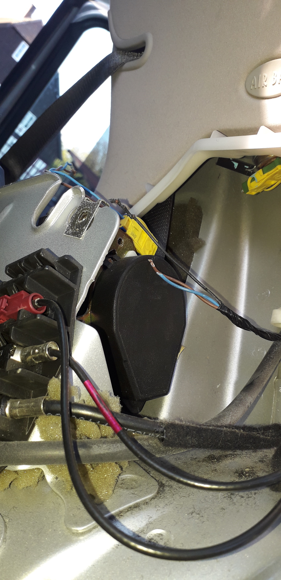 De 30cm-re hátulról fekete is jön előre. A 30 centiben van 2 csatlakozó amibe barna és kék kábel megy. Egyik csati a biztonsági öv szerkezetéhez van rögzítve a másik felette van a kárpit mögött, szerintem ott a légzsák.